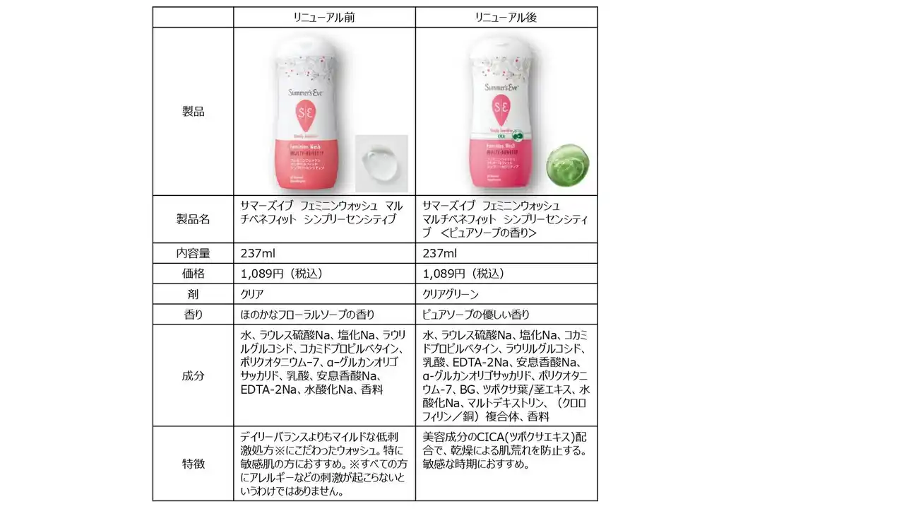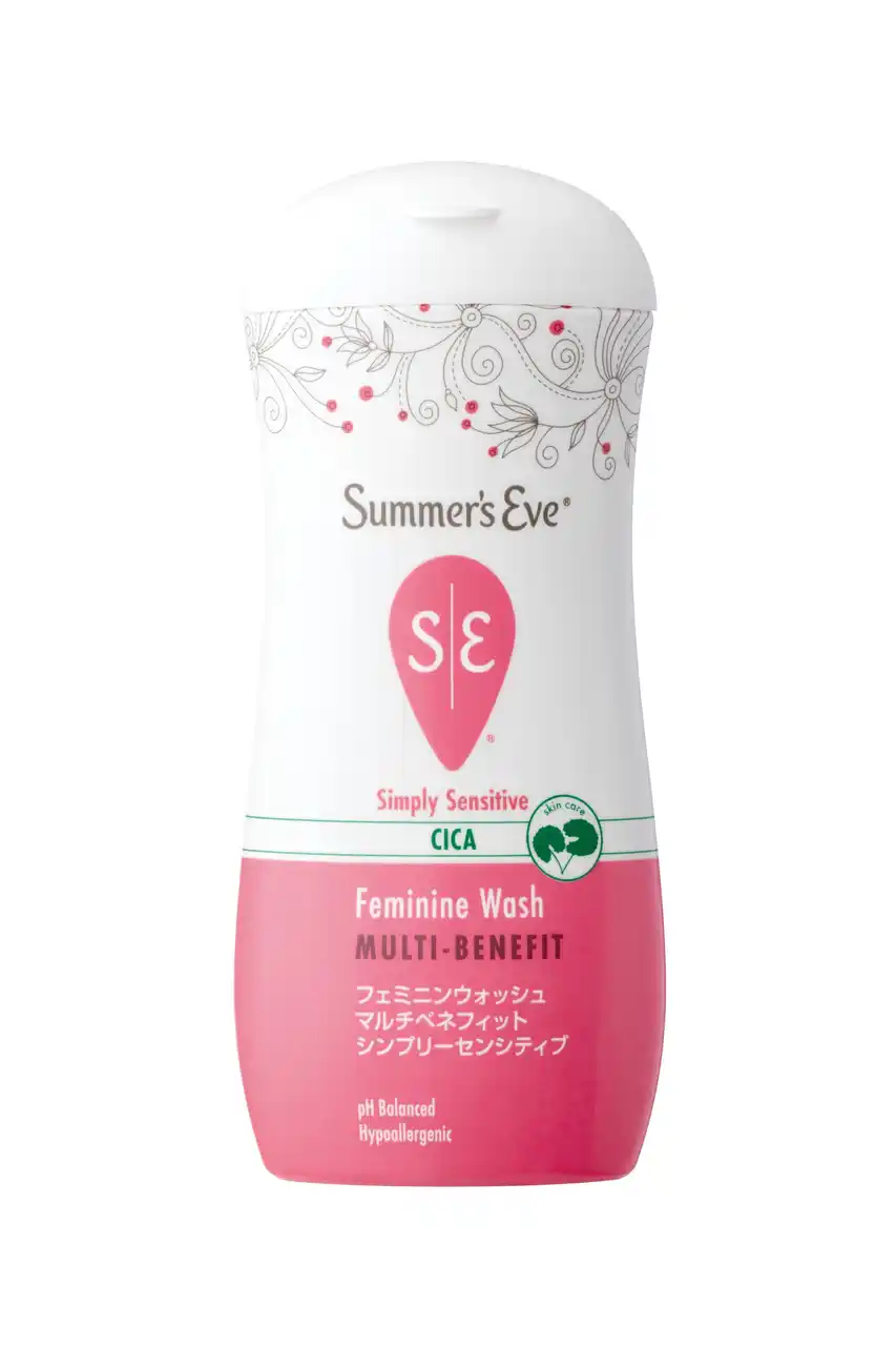敏感肌向けのフェミニンウォッシュ「サマーズイブ フェミニンウォッシュ マルチベネフィット シンプリーセンシティブ」から、人気の美容成分CICA(ツボクサエキス)を配合してリニューアルした本製品は、肌荒れ*¹、ピリピリ*²を感じる時期や、VIO処理後、生理中*³にも使用できる弱酸性処方で、ピュアソープのやさしい香りです。 |