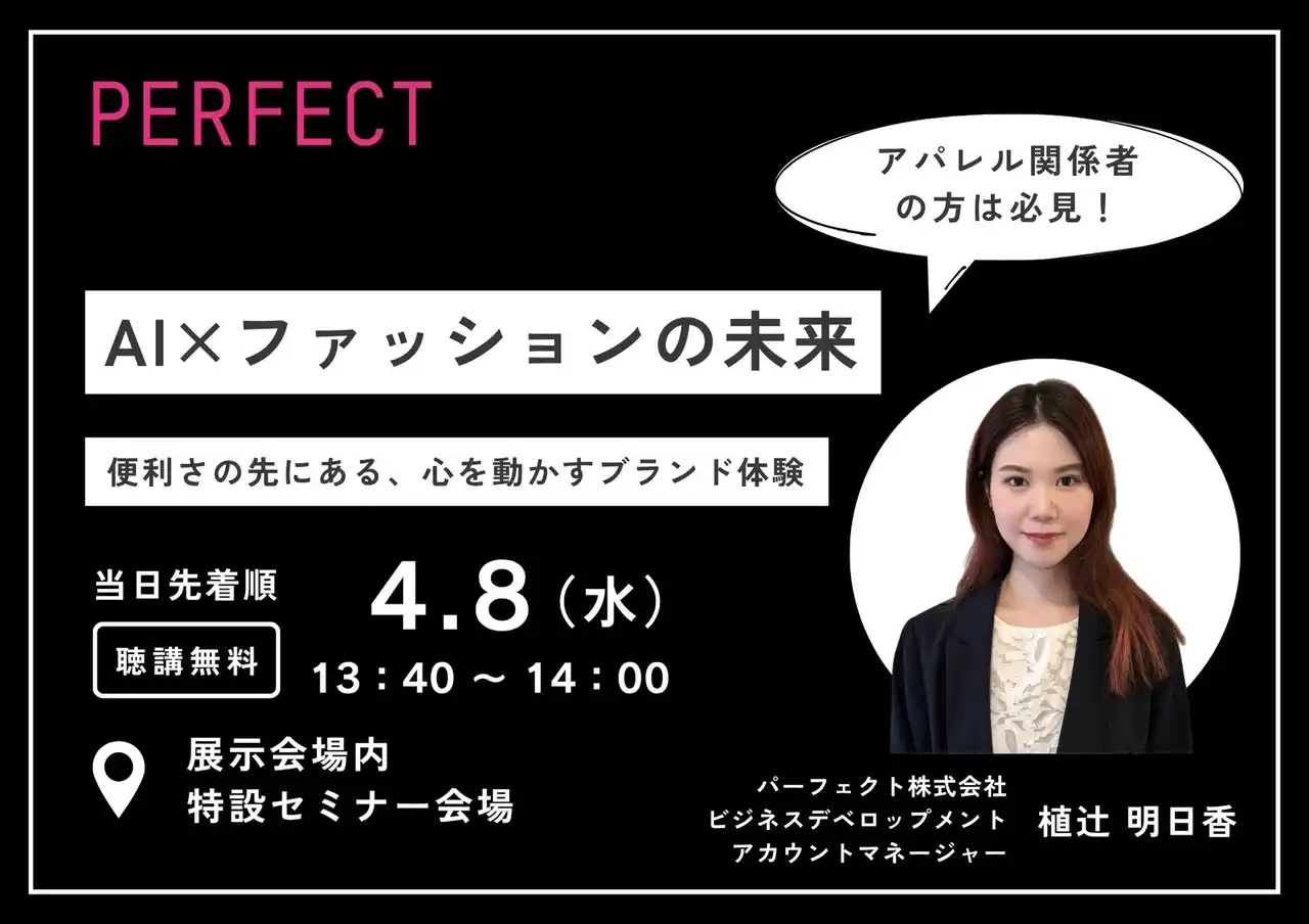 「消費者の生活をより美しく」をスローガンに掲げるパーフェクト株式会社は、2026年4月8日(水)~10日(金)に東京ビッグサイトで開催される、第29回 ファッションワールド東京に出展し、生成AIを活用した「AI服試着ツール」を展示いたします。 |