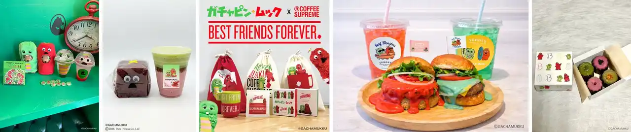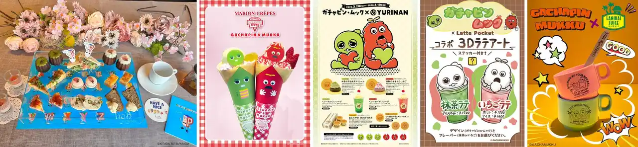 (画像左から順に)【boB the garden Ginza】アルファベッツでデコレーションでされた特別なアフタヌーンティー。【マリオン(原宿竹下通り店)】ガチャピンはメロンやマスカットのフレーバー、ムックはいちごフレーバーで見た目も楽しいクレープ。【YURINAN はなれ】抹茶あんといちごあんのどら焼きの他、コラボドリンクも登場。【Latte Pocket】抹茶ラテとイチゴラテの上にカップから飛び出すふわふわの3Dラテアート。【LANIKAI JUICE】(原宿竹下通り店/表参道店)ふたりをイメージしたアサイーボール。グリーンカップは原宿竹下通り店、オレンジは表参道店で発売。 |