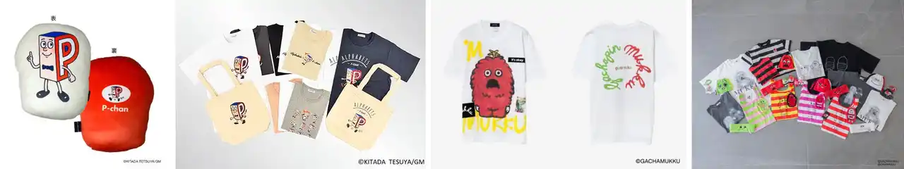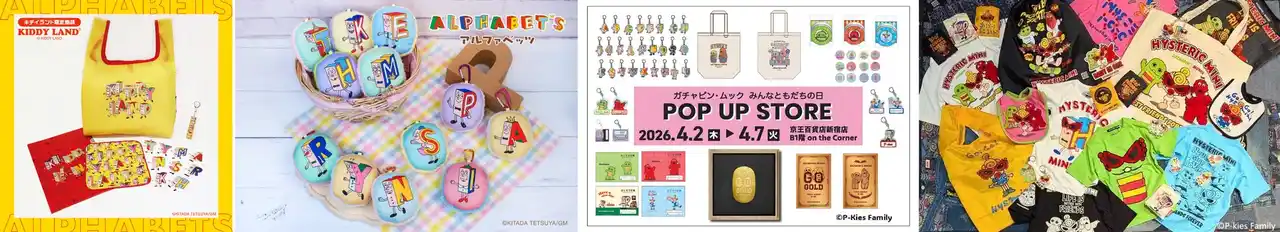 (画像左から順に)【トーマントイズ(KIDDY LAND限定販売)】両面でデザインが異なるエコバッグやタオルなど雑貨を中心に展開。【内藤デザイン研究所】アルファベッツのカラビナ付きマスコット。人気のイニシャル12種類を販売。【ニッポン放送プロジェクト】「ガチャピン・ムック みんなともだちの日 POP UP STORE」を新宿京王百貨店で開催。雑貨商品を中心に純金商品の先行予約販売も実施。【HYSTERIC MINI】ガチャピン・ムックの遊び心に、HYSMINIのエッジを効かせた唯一無二のストリートコレクション。 |