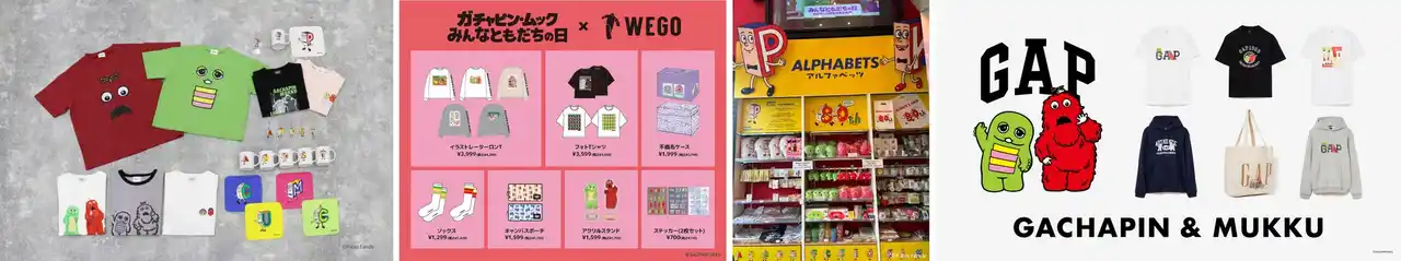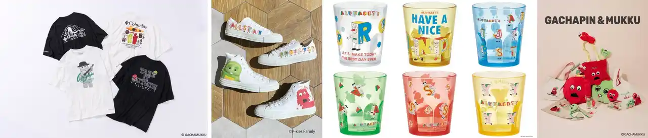 (画像左から順に)【and ST / and ST TOKYO】コラボアイテムの販売の他、原宿の「and ST TOKYO」では体験コンテンツを展開。【WEGO】ロンTやTシャツをはじめ、一緒にお出かけも出来るアクリルスタンドなどが登場。【KIDDY LAND】9店舗にて展開。特別Verのアルファベッツ描き下ろしショッピングバッグも限定配布。【Gap】Gapロゴとスペシャルアートが光る大人とキッズ向けのスウェット、Tシャツ、トートバック。 |