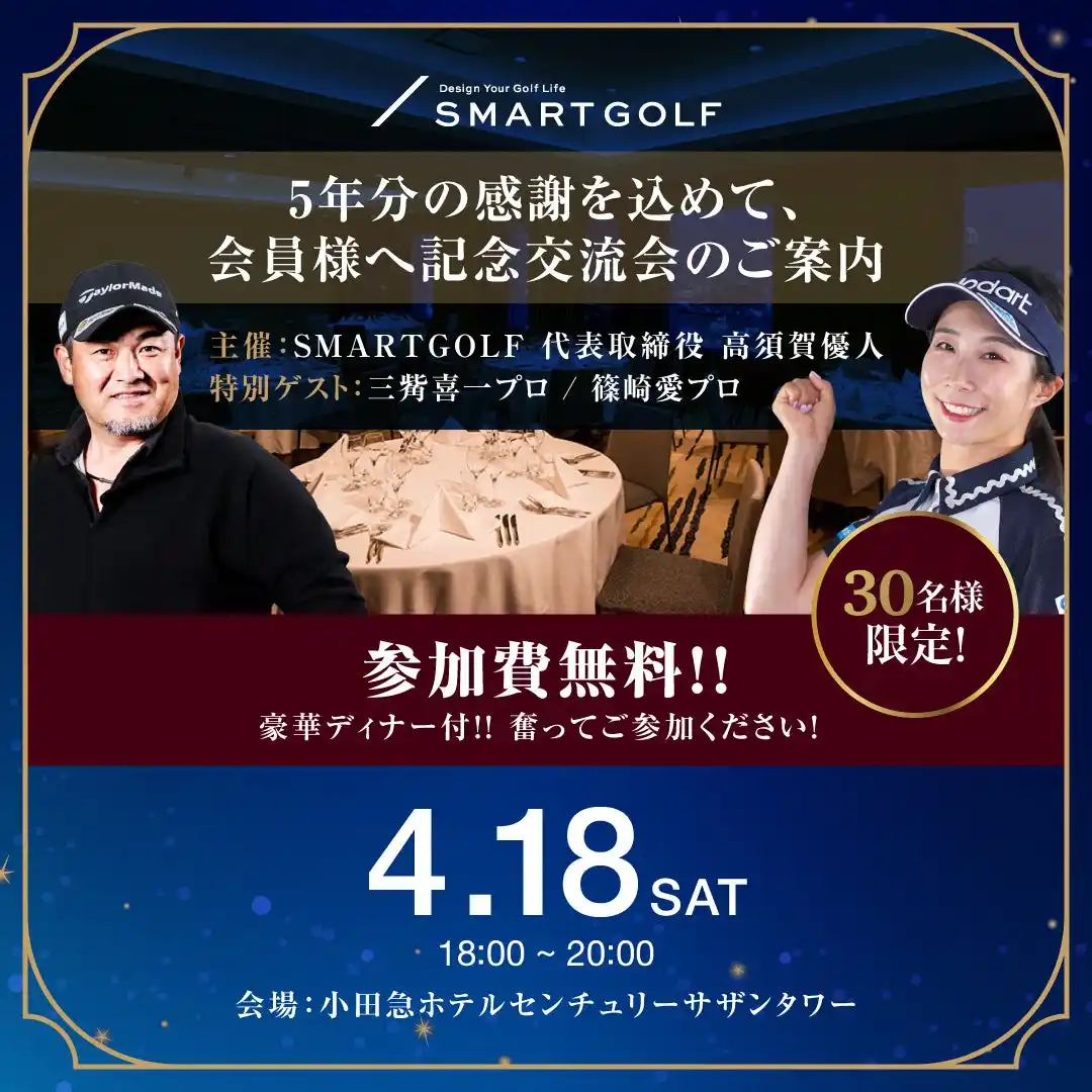 SMART GOLFを長くご利用いただいている会員様を中心に、小田急ホテルセンチュリーサザンタワーにて感謝祭を開催します。三觜喜一プロ、篠崎愛プロをゲストに迎え、ゴルフ談義を交えた交流の場を提供します。 |