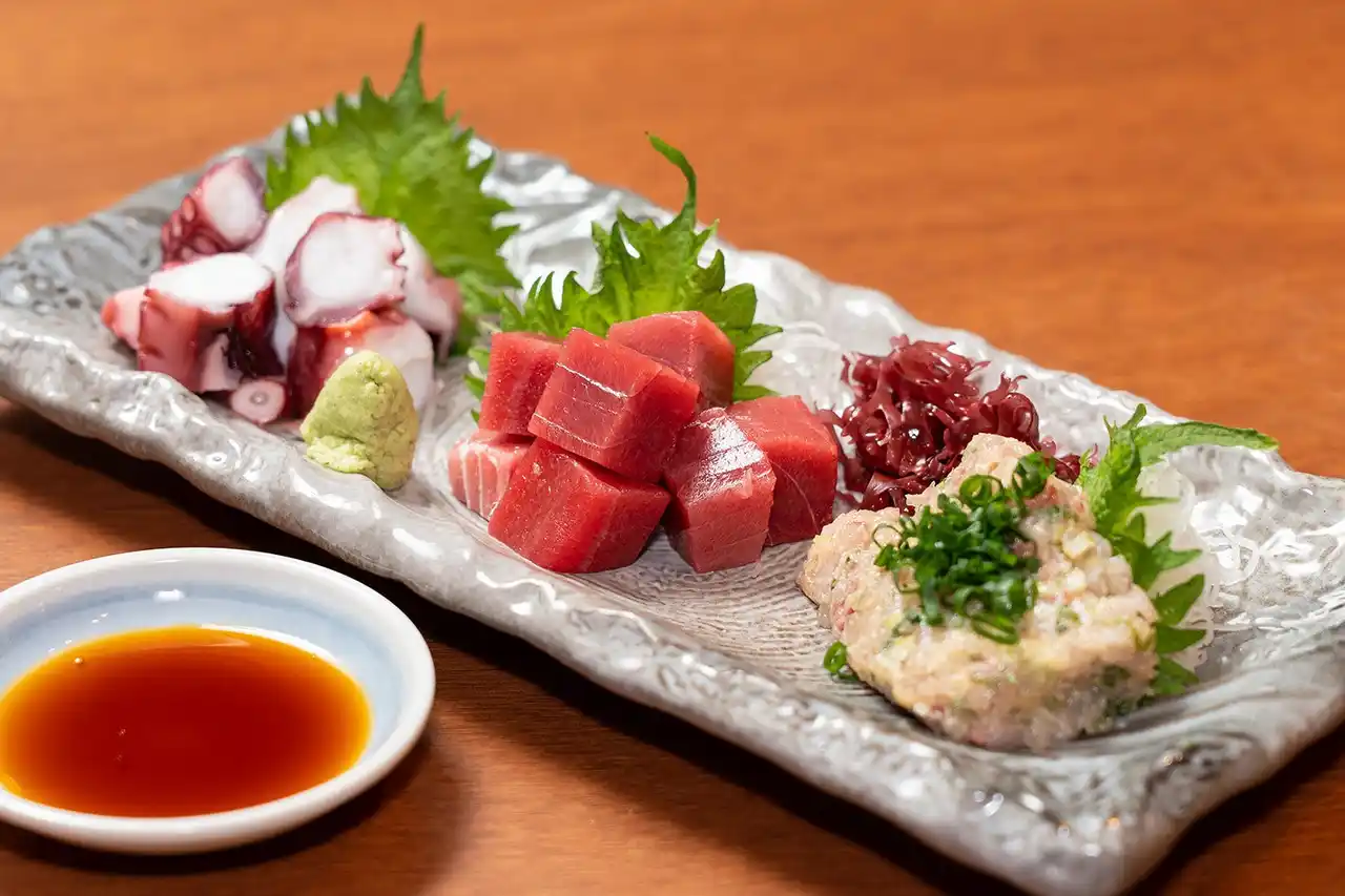 | 名物の「もつ煮込み」(450円)も、『満天酒場』を象徴する一皿です。開業以来20年以上守り続けてきたオリジナルの白湯ベースで仕上げており、何時間もかけて丁寧に煮込むことで、深いコクと旨みを引き出しています。さらに、特製の辛味噌を加えることで味の変化も楽しめます。新鮮な刺身も見逃せません。「鮪ブツ」「タコブツ」(各390円)は、豊洲市場直送ならではの鮮度で、しっかりとした質の高さを感じられます。 | ||||||||||||||
