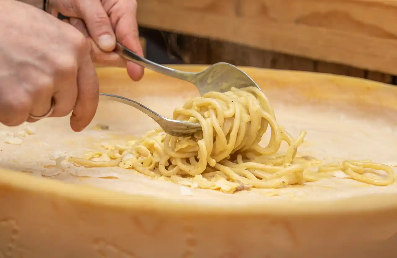 大きなチーズの器でパスタを絡めた後、仕上げにお皿へ美しく盛り付けます。 |