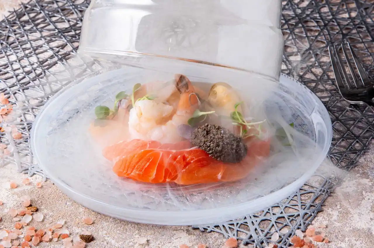 ・瞬間燻製 魚介の前菜3種盛り合わせ(お客様の目の前でドームを開けるライブ演出) |