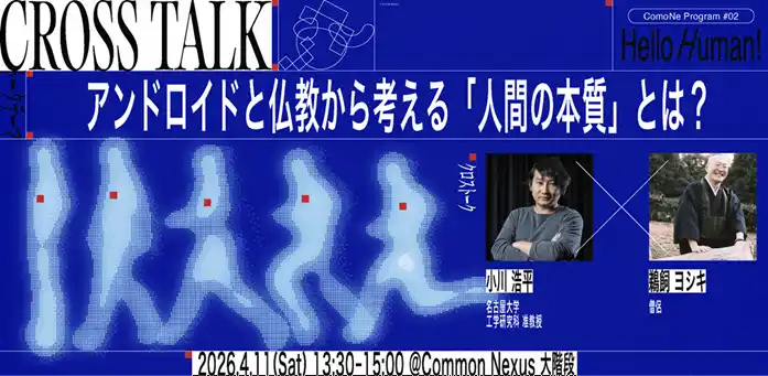 「ComoNeプログラム」は、市民・研究者・クリエイターを巻き込みながら、ComoNeに集まるみんなで探究するプログラムです。2026年4月からは新テーマ「ComoNeプログラム#02 -Hello Human!-」が開催されます。新しい展示が始まることに合わせ、本テーマを深めるべく、2名のゲストを迎えてクロストークを開催。 |