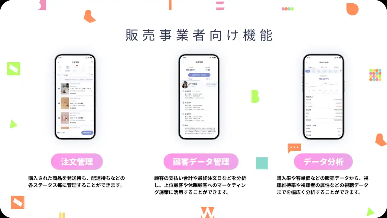 販売事業者がライブ配信を通じて消費者とリアルタイムにコミュニケーションを取りながら商品の紹介と販売を行うことができるほか、配信外でも商品購入ができるモール機能やSNSのDM機能がついていることも特長です。 |