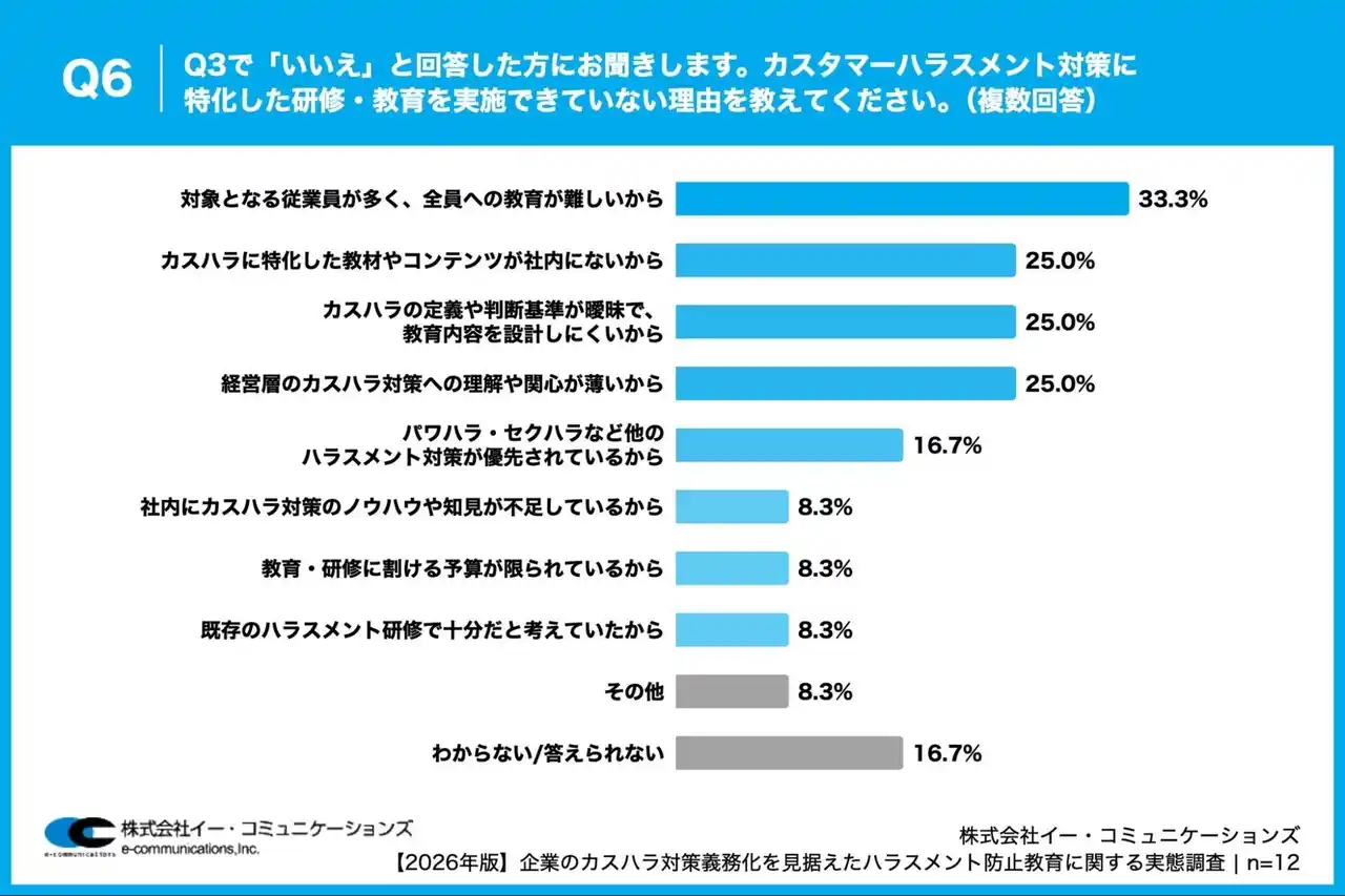 「Q6. Q3で「いいえ」と回答した方にお聞きします。カスタマーハラスメント対策に特化した研修・教育を実施できていない理由を教えてください。(複数回答)」(n=12)と質問したところ、「対象となる従業員が多く、全員への教育が難しいから」が33.3%という回答となりました。 |