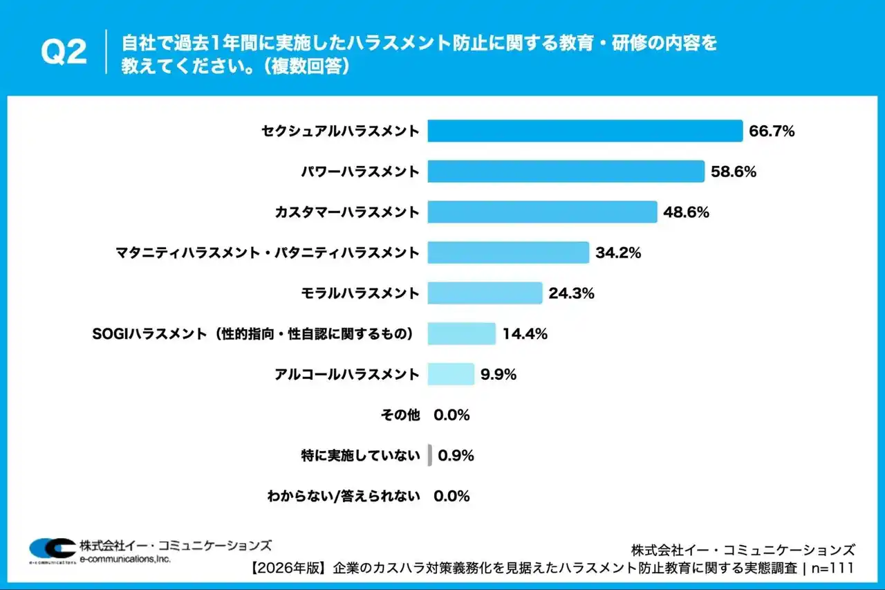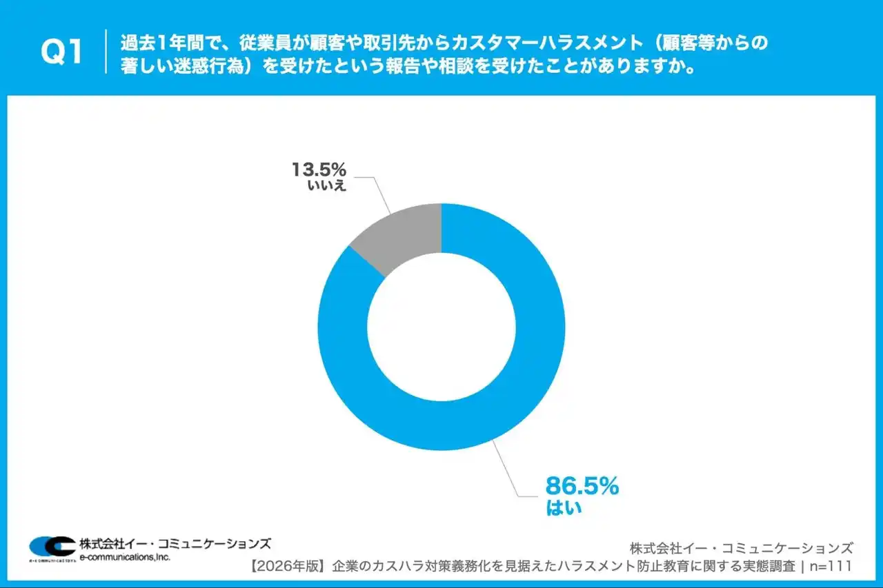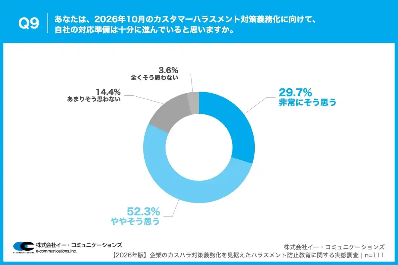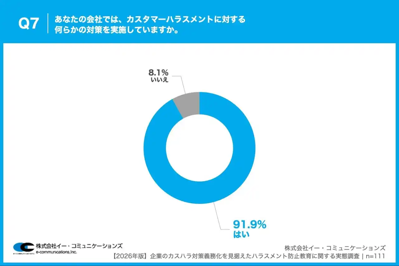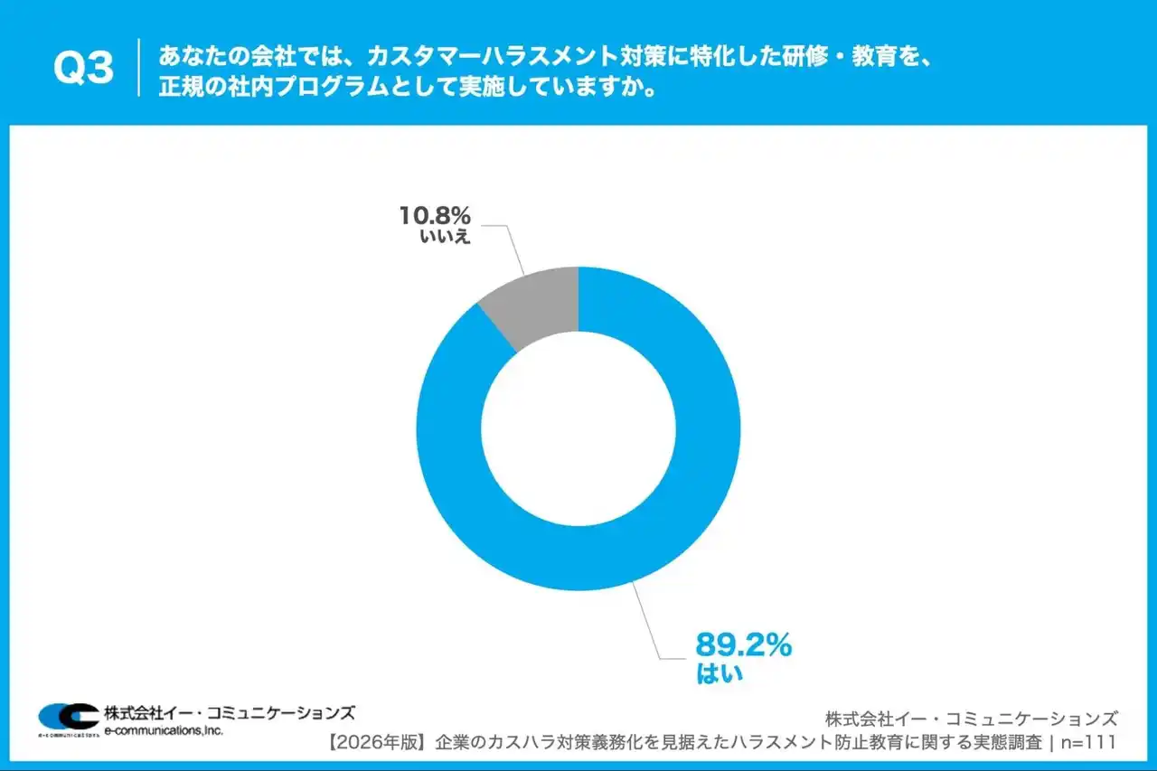 株式会社イー・コミュニケーションズ(本社:東京都港区、代表取締役:佐藤信也)は、従業員数100名以上の企業で、ハラスメント対策や社員教育・研修の企画・運営に携わっている人事・総務担当者111名を対象に、【2026年版】企業のカスハラ対策義務化を見据えたハラスメント防止教育に関する実態調査を実施しましたので、お知らせいたします。