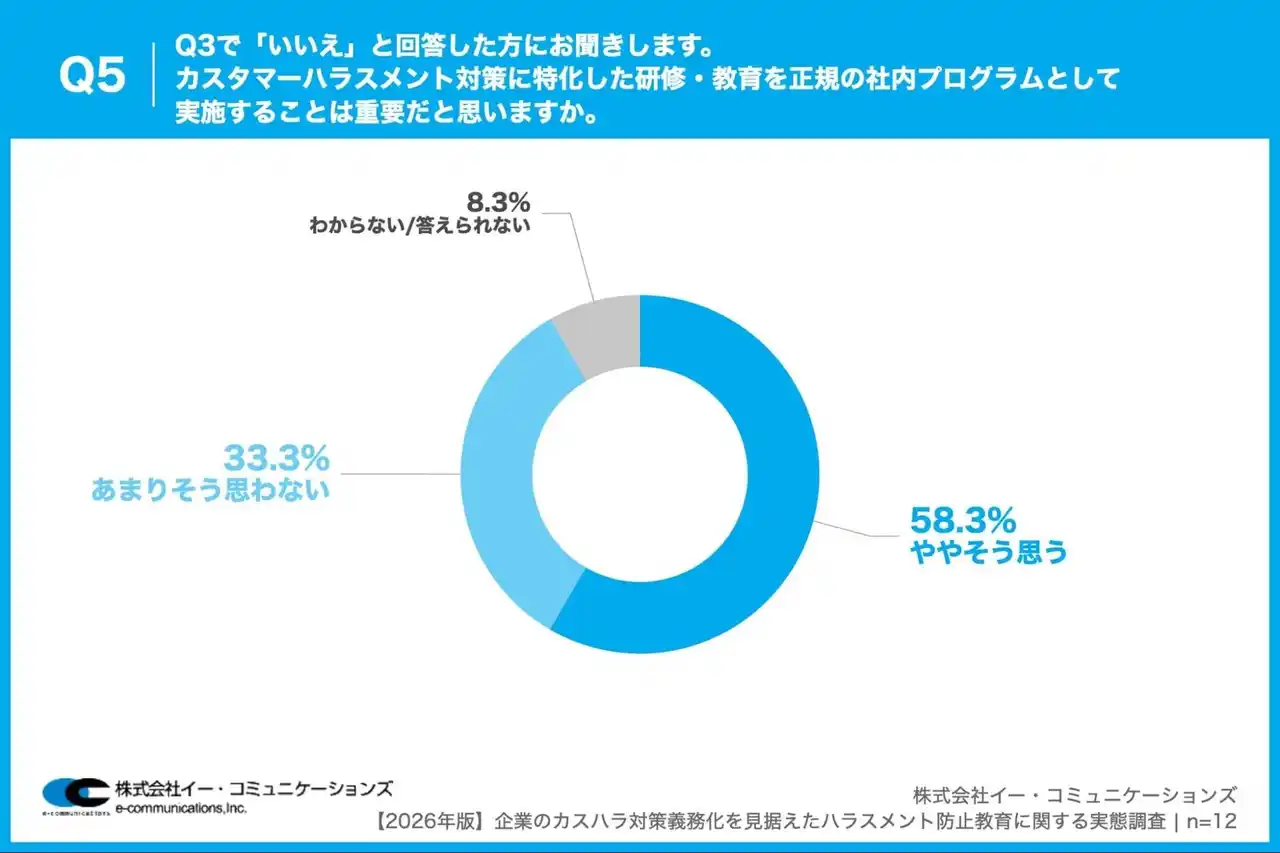 「Q5. Q3で「いいえ」と回答した方にお聞きします。カスタマーハラスメント対策に特化した研修・教育を正規の社内プログラムとして実施することは重要だと思いますか。」(n=12)と質問したところ、「非常にそう思う」が0.0%、「ややそう思う」が58.3%という回答となりました。 |
