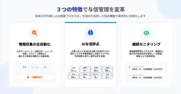 ・特徴: AI与信評点、発注・受注別与信限度額、財務3期推移、ネガティブ情報照会 |