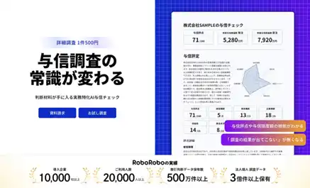 「RoboRobo AI与信チェック」は、膨大なインターネット情報と独自のAIアルゴリズムを融合し、従来は数千円~数万円のコストを要していた与信調査を、1件500円かつ詳細レポート出力付きという圧倒的なパフォーマンスで実現。高額/属人的/時間がかかるといった従来の与信調査の常識をAI技術によって根本から覆し、取引先調査のDXを加速させます。 |