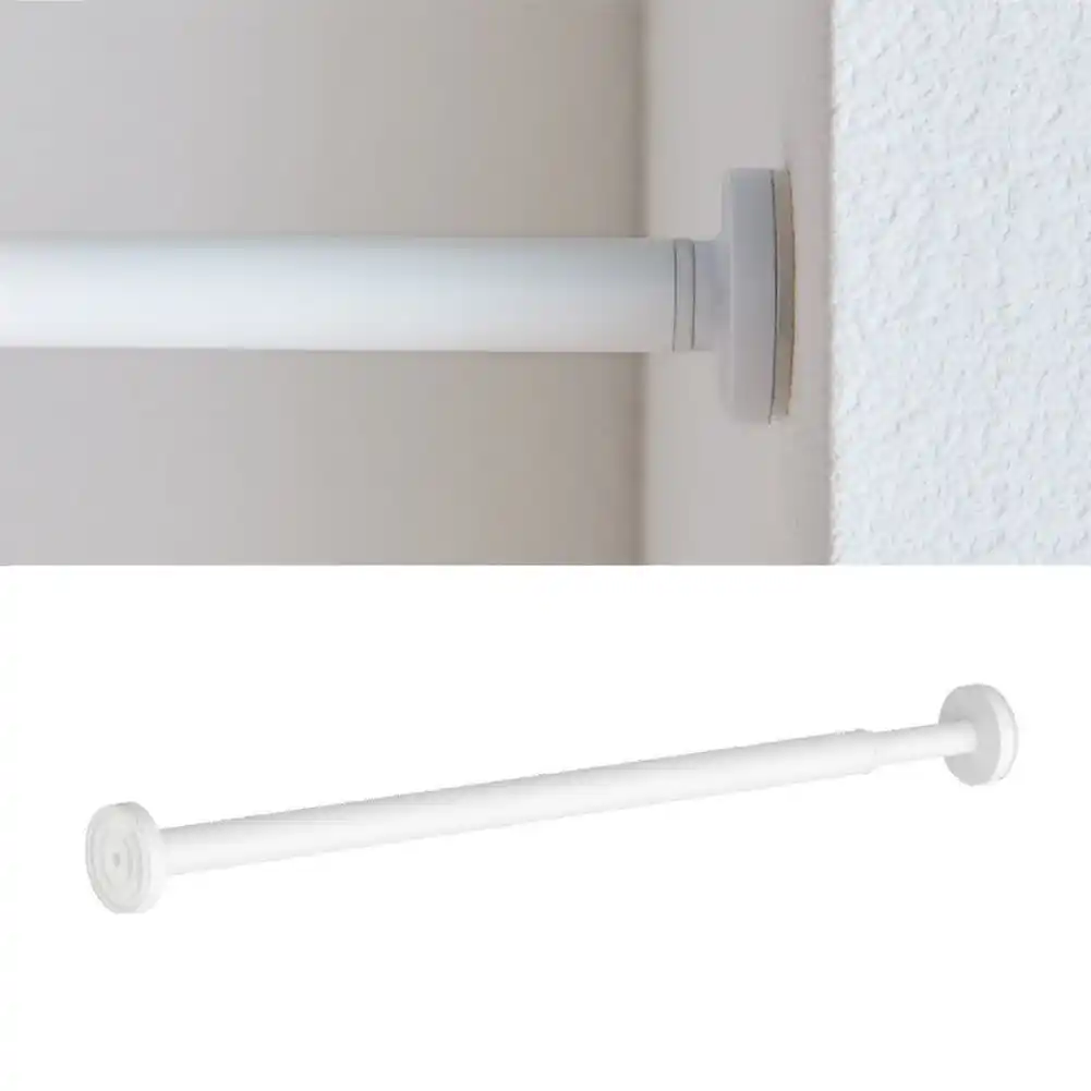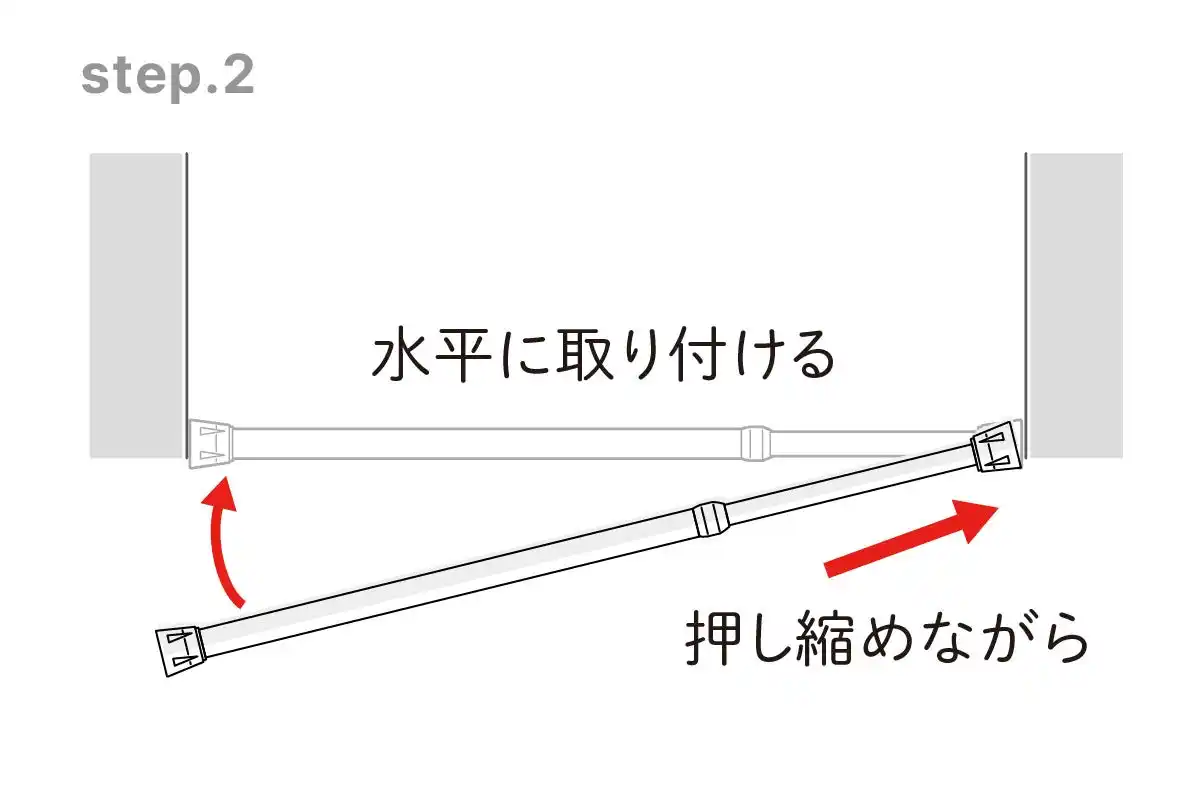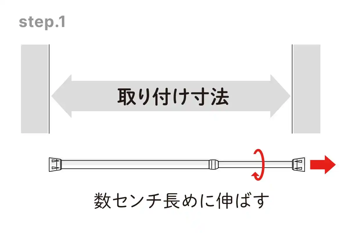あらかじめ壁の幅より「数cm長く」伸ばしておき、バネを押し込みながら取り付ける。 |