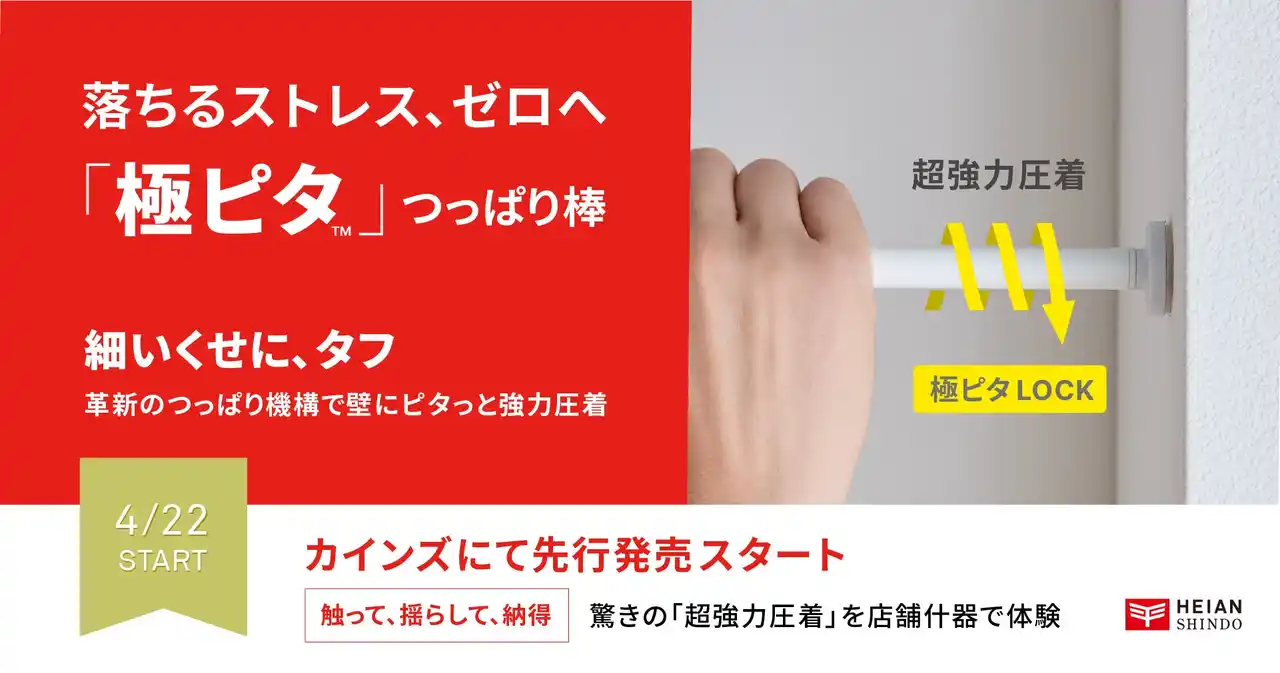 平安伸銅工業株式会社(本社:大阪府大阪市、代表取締役:竹内 香予子)は、突っ張り棒の最大の悩みである「突然の落下」を構造から解決する新製品「極ピタ」を開発しました。