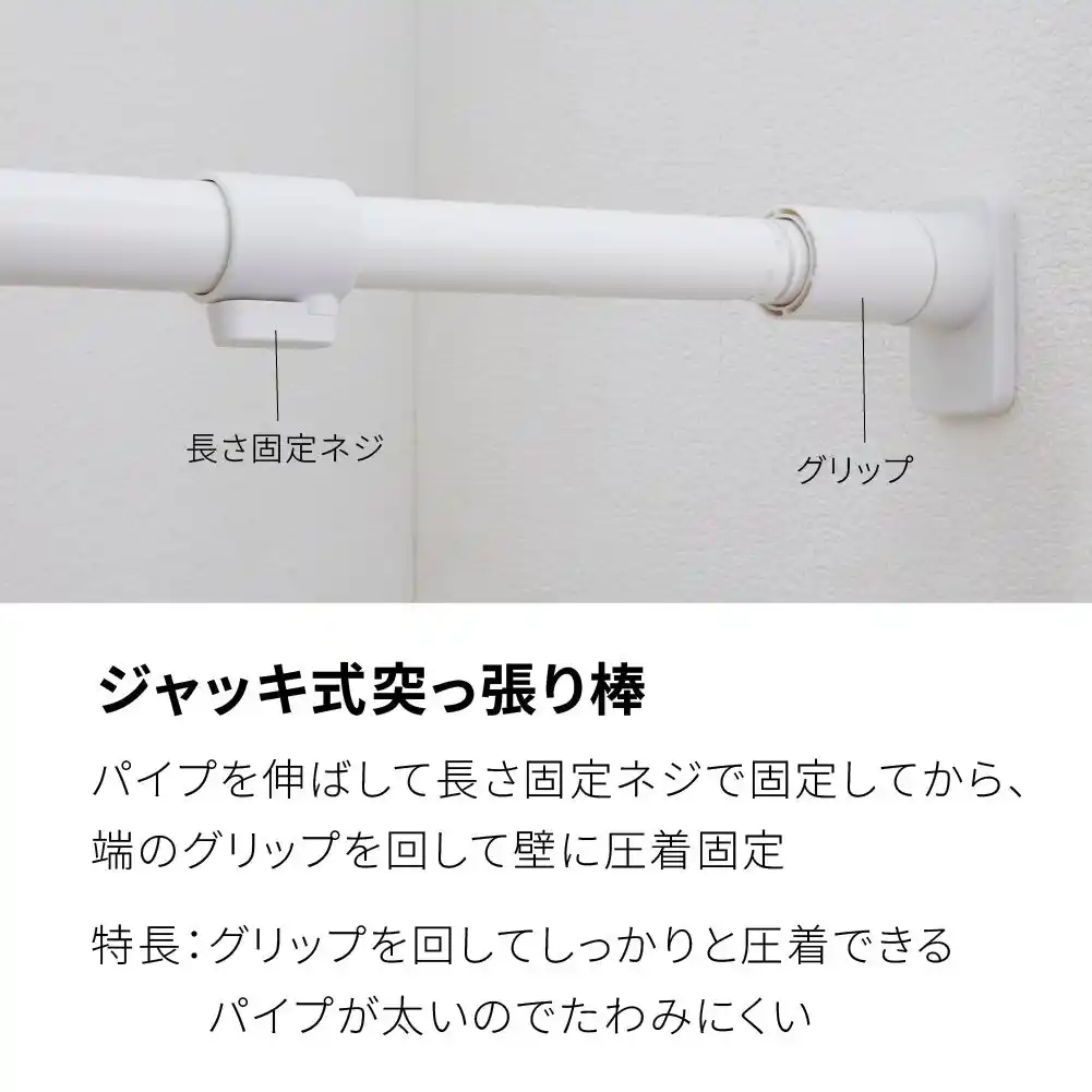 パイプを回せば回すほど強い力がかけられる独自の内部構造により、手軽なサイズ感でありながら、ジャッキ式の突っ張り棒に匹敵する圧着力で壁を力強く押し返し、しっかりと固定します。 |