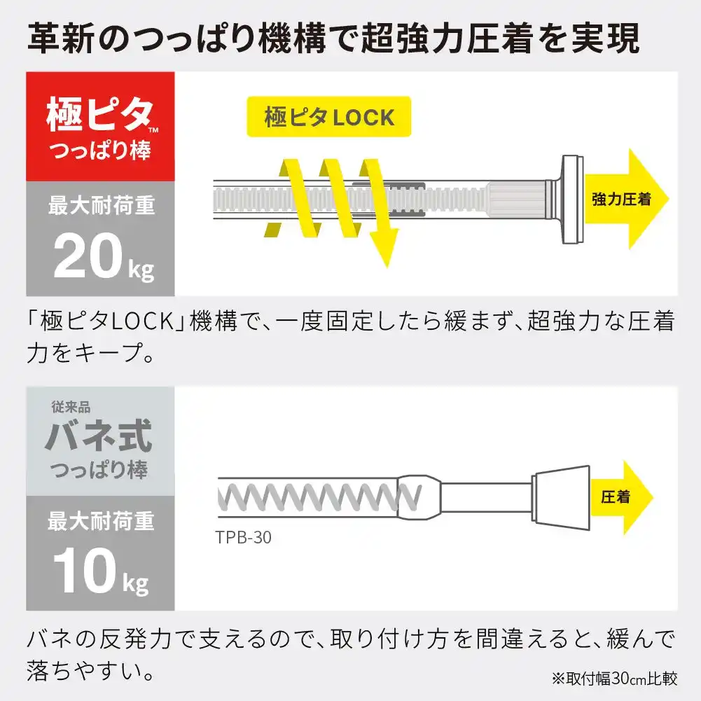 新機構「極ピタLOCK(*3)」により、パイプを回すだけで「長さの伸縮」と「壁への圧着」が同時に完了します。従来のバネ式で必要だった「パイプを縮めて押し込む」手順は不要です。複雑な手順は一切ありません。誰が取り付けても製品本来の圧着力を引き出せる、失敗知らずの設計です。 |