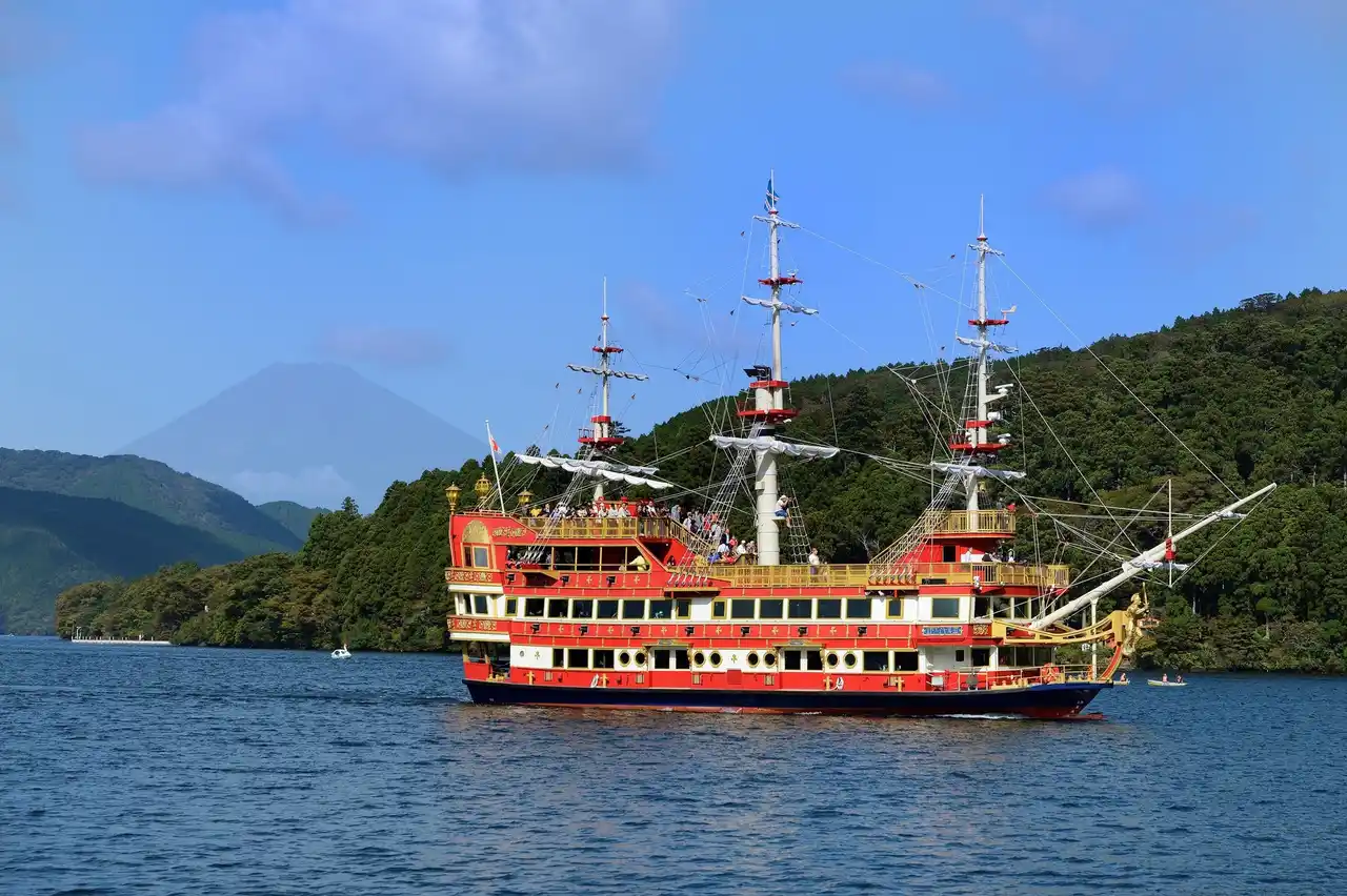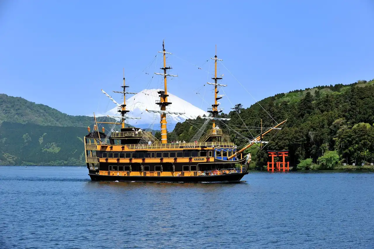 海賊船にはクイーン芦ノ湖・ロワイヤルII・ビクトリーの3隻が運航しており、全船がバリアフリーに対応しています。湖上から見る箱根神社や富士山、芦ノ湖の四季折々の景観はひときわ美しく、船内カフェではオリジナルコーヒーや宝箱をイメージしたパイシューなどをご用意し、旅の移動時間にほっとひと息つくカフェタイムをお届けします。 |