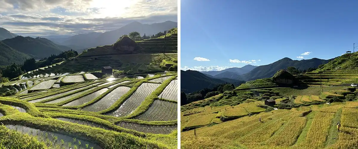 山肌に寄り添うように連なる棚田は、季節ごとにその装いを変えます。水を張った春には空と山々を映し出す無数の水鏡が現れ、夏には青々とした稲穂が風にそよぎ、秋には黄金色の絨毯が山の斜面を染め上げます。そして冬、稲が刈り取られた後には、先人たちが一つひとつ積み上げた石垣の造形美が静かに姿を現し、悠久の時の流れを感じさせてくれます。 |