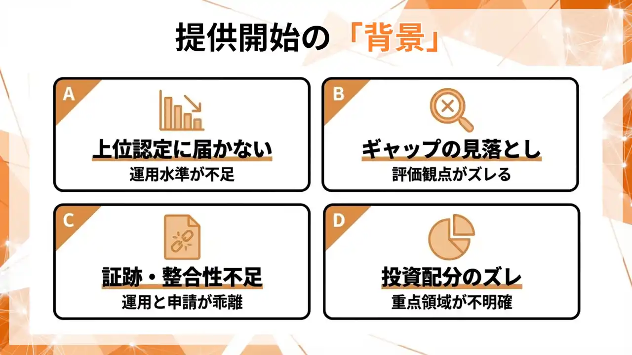 一方で、ネクストブライトになった企業の多くは、努力不足というよりも、申請上の評価観点に対するギャップの見落とし、運用・証跡・改善の整合性不足、重点領域への投資配分のズレなどがボトルネックになりやすい構造があります。 |