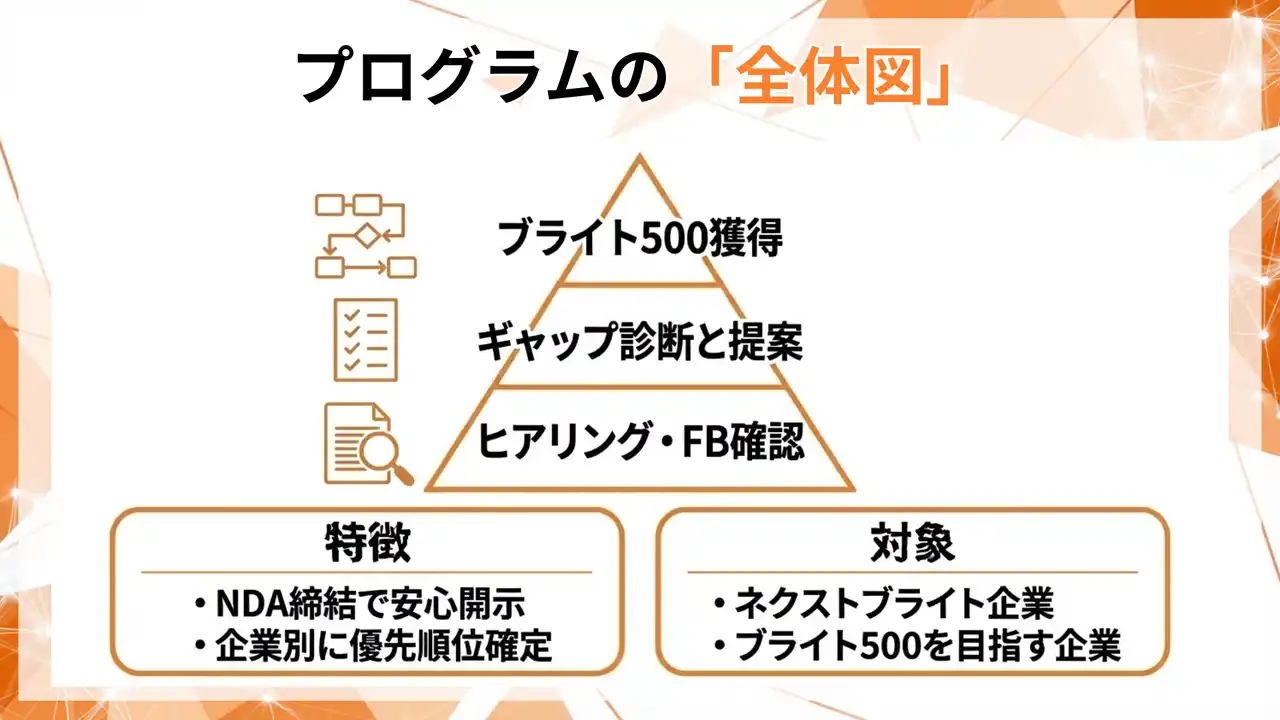 本プログラムは、その前提に立ち、NDA締結の上でフィードバック情報を確認し、次年度のブライト500に向けた実行計画へ落とし込む支援を提供します。 |