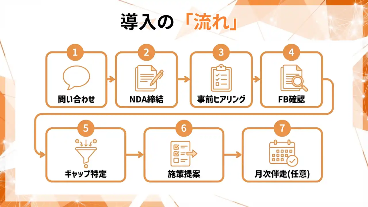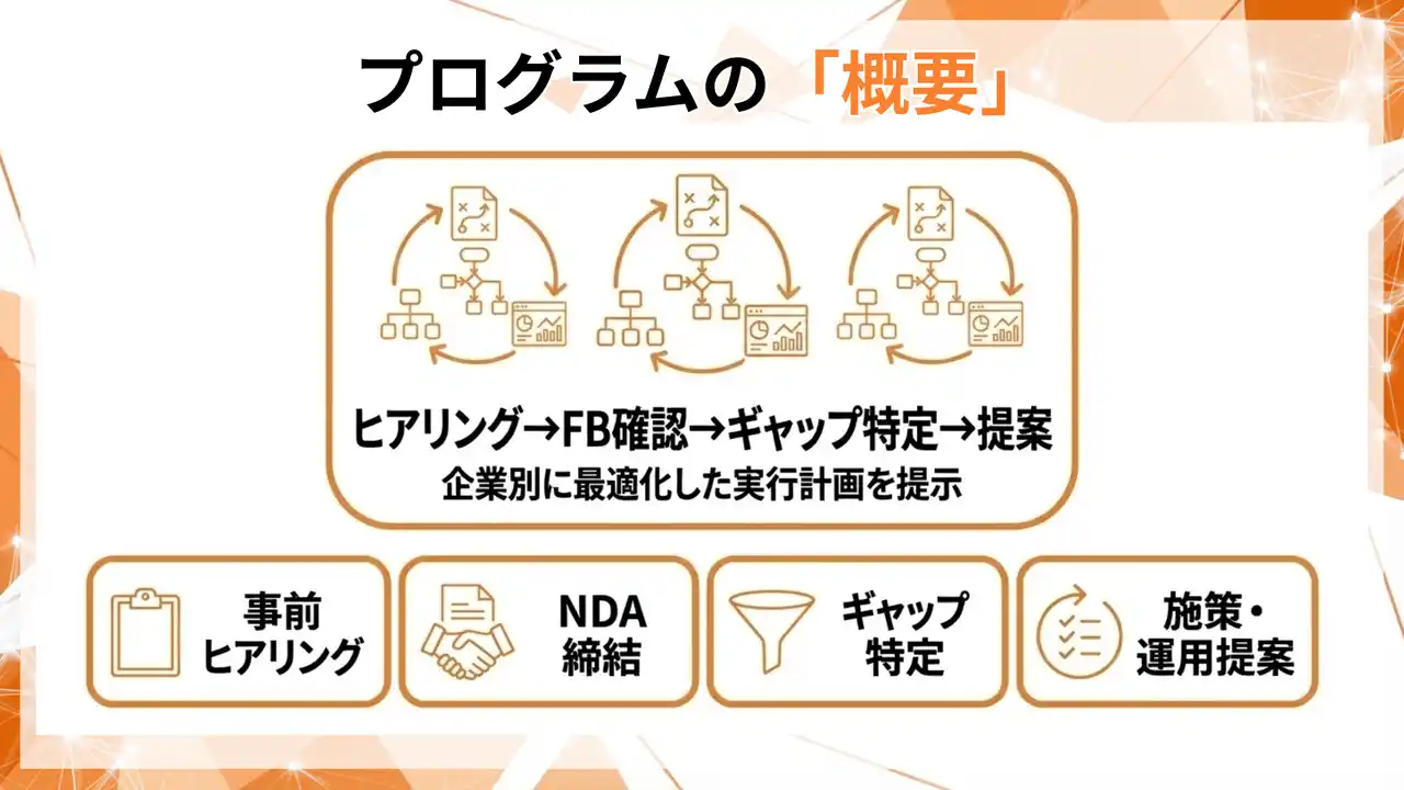 プログラム概要(ヒアリング→フィードバック確認→ギャップ特定→提案) |