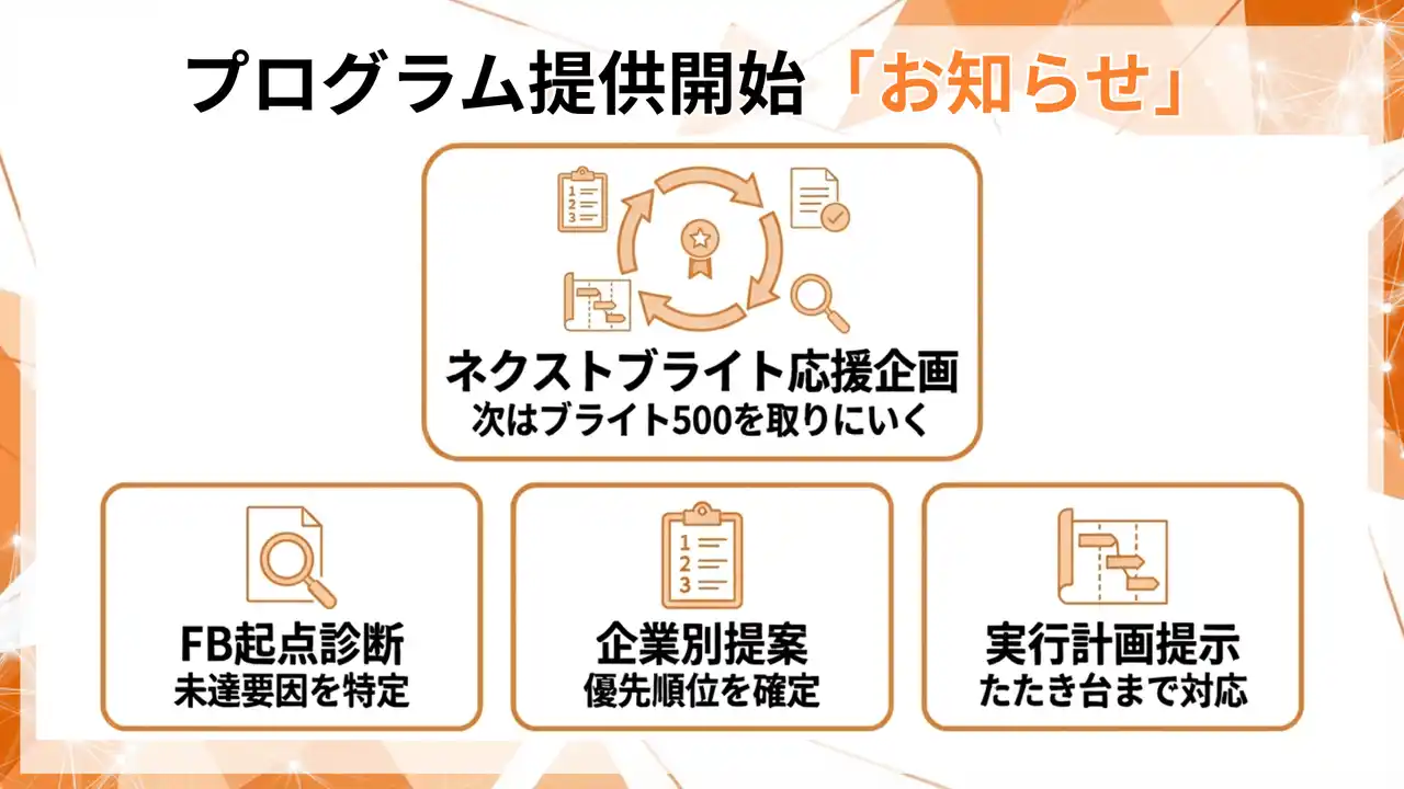 本プログラムは、ネクストブライトとなった企業様が次年度にブライト500を狙うために、ヒアリングと2026申請フィードバックシートの確認を起点に、未達要因と不足ギャップを特定し、必要施策・運用・証跡を企業別に提案する支援です。 |