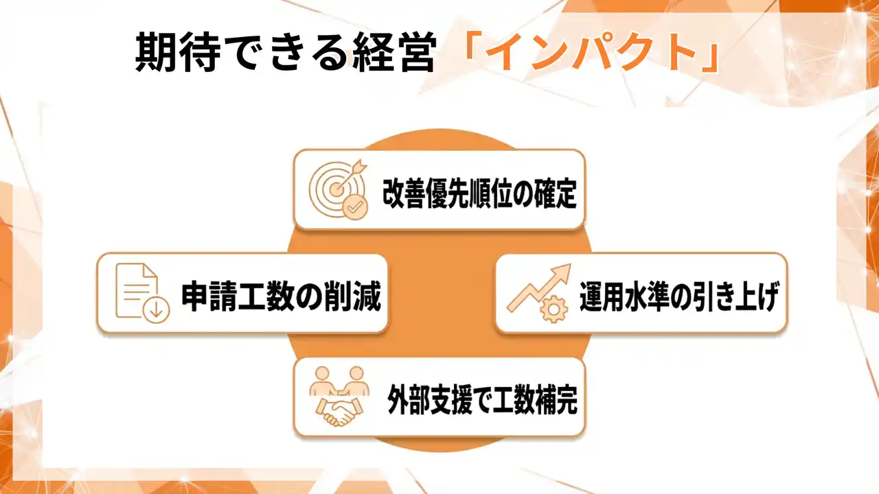 申請対応の手戻りと担当工数を削減 必要証跡と運用を前倒しで整備し、直前の集め直し・修正を減らします。 |