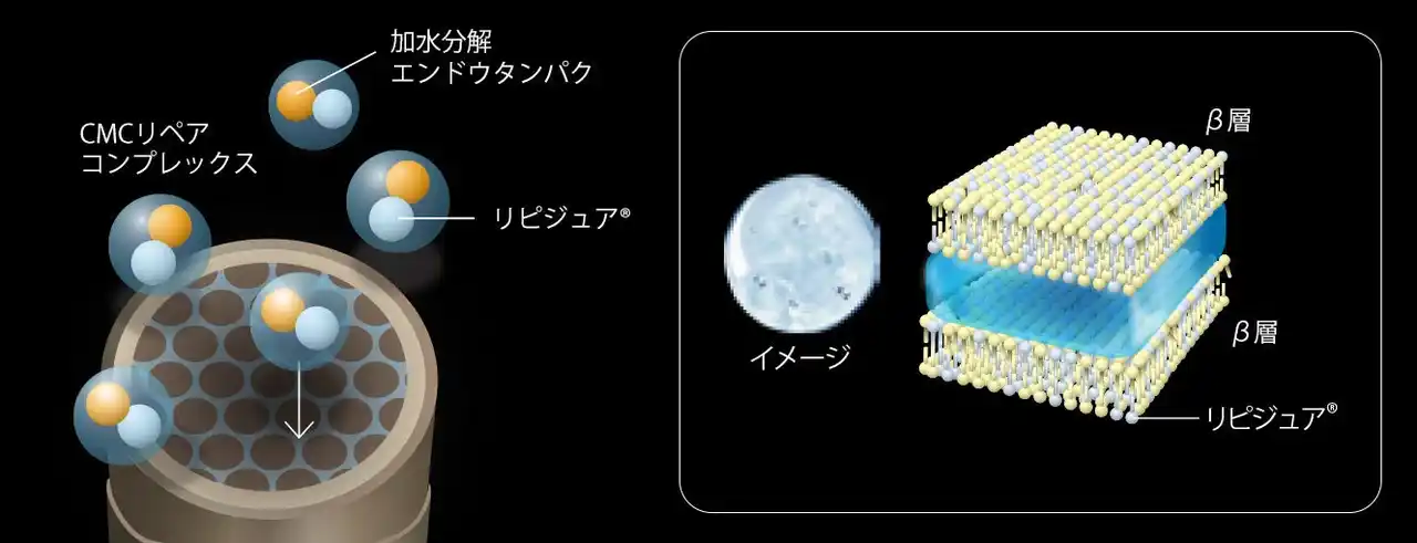 本リニューアルでは、リピジュア(R)【ポリクオタニウム-64(毛髪補修成分)】と加水分解エンドウタンパクを組み合わせた新開発のCMCリペアコンプレックスを配合。リピジュア(R)【ポリクオタニウム-64(毛髪補修成分)】は、毛髪内部のCMC(細胞間脂質)におけるβ層構造をサポートし、繊維内部のダメージを補修。さらに毛髪保護成分である加水分解エンドウタンパクとの相乗効果により、カラー施術中の毛髪コンディションを整えながら保護する「リペア効果」を発揮します。これにより、インパクトのあるクリエイティブカラー表現と、なめらかで艶のある仕上がりの両立を実現しました。 |