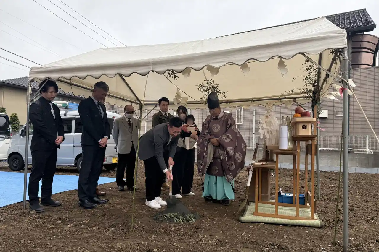 地鎮祭で鍬入れを行う代表(2026年3月31日/埼玉県越谷市)。本プロジェクトの関係者が参列 |