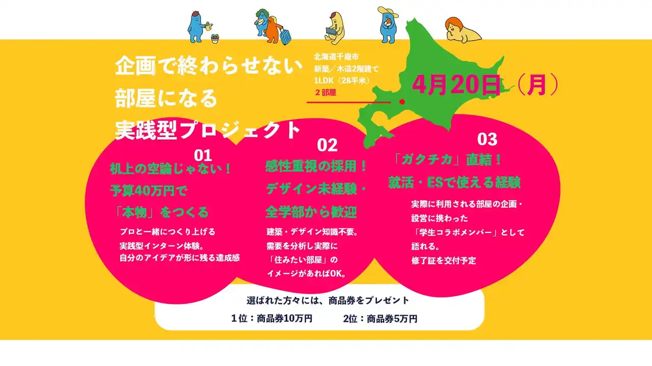 | 今、北海道千歳市は半導体工場の建設や関連企業の進出で、中長期滞在の需要が急増しています 。そんな千歳の「住まいの新しい選択肢」を、学生ならではのフレッシュな感性で作り上げます ! | |||