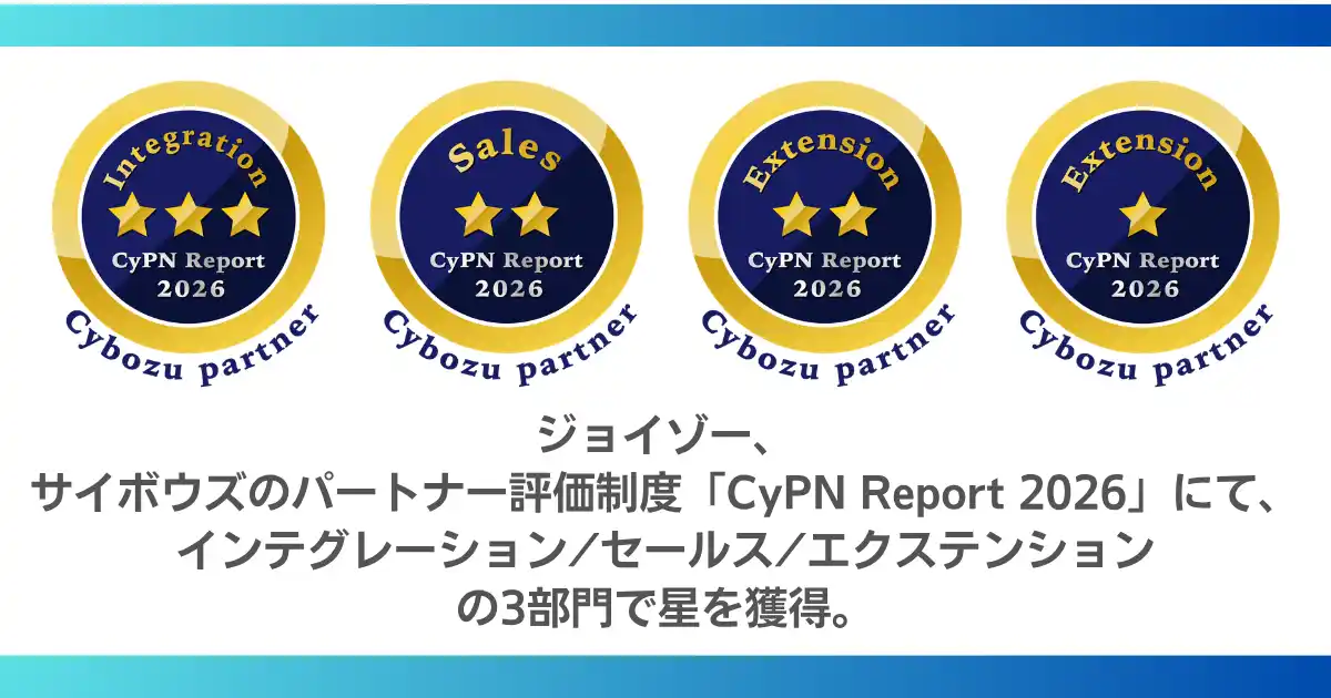 | kintone(キントーン)専業のシステム開発会社である株式会社ジョイゾー(本社:東京都江東区、代表取締役社長:四宮靖隆、以下ジョイゾー)は、サイボウズ株式会社(本社:東京都中央区、社長:青野慶久、以下サイボウズ)のオフィシャルパートナー評価制度「Cybozu Partner Network Report 2026」(以下「CyPN Report 2026」)において、インテグレーション、セールス、エクステンションの3部門で星の評価を獲得したことをお知らせいたします。制度開始から5年連続で高い評価をいただく結果となりました。 | |||
