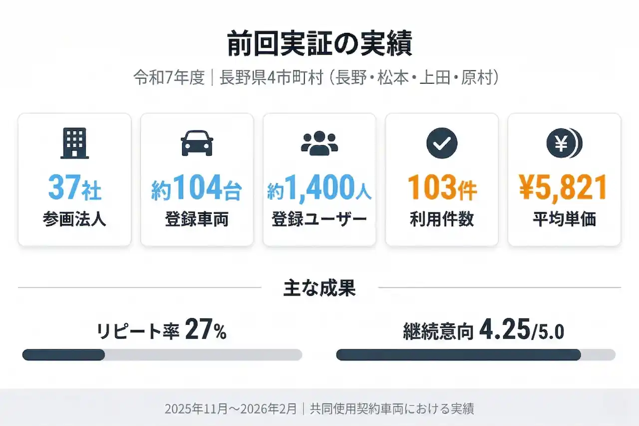 <定性的成果> ・利用者の27%が複数回利用し、継続利用が見込めるユーザー行動を確認 (対象:実証期間中にサービスを利用した60名) ・車両提供者へのヒアリングでは、継続提供意向が5段階評価で平均4.25 (N=11、「そう思う」「ややそう思う」が100%) ・運用後の業務負担は月1~3時間程度に収まり、法人側の高い受容性を確認 ・自治体担当者から「オンデマンドバス等と比較して行政コストが低く、導入しやすい」との評価を獲得(N=4、導入・運営可能性:平均4.0) |