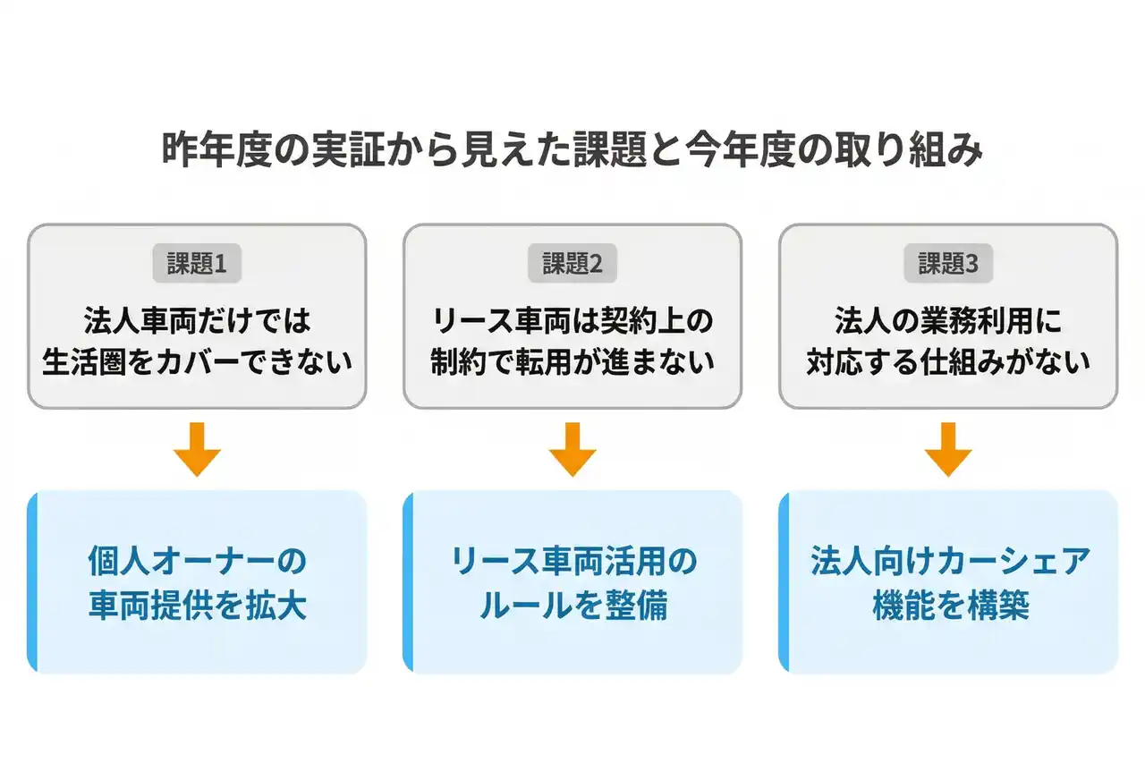 | 昨年度の実証で自家用車カーシェアの有効性が確認された一方、サービス拡大に向けた課題も明らかになりました。法人車両だけでは提供場所が事業所周辺に偏るため、住宅地や駅周辺など生活圏全体をカバーするには、個人が所有する車両もカーシェアに提供できる仕組みが不可欠です。また、車両を貸し出したいという法人の声が多く寄せられた一方、リース車両は契約上の制約から転用が進んでおらず、リース車両を活用するためのルール整備が急務となっています。加えて、法人から業務利用のニーズも確認されており、経費処理や権限管理に対応したシステムの整備が求められています。 | |||||||