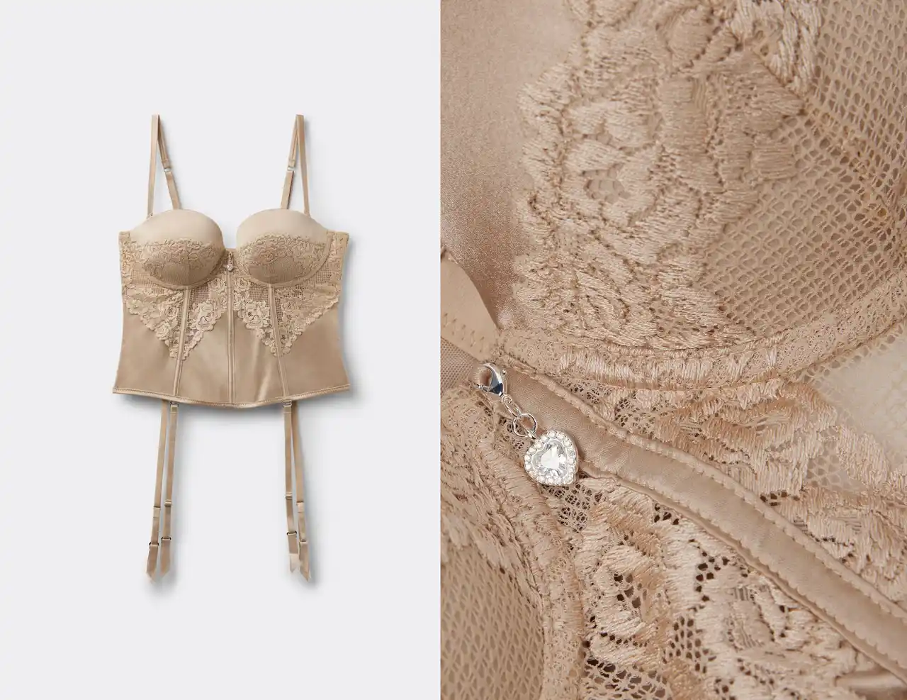 伸縮性のあるシルクサテンを使用した、エレガントで洗練されたゲピエール。花の刺繍を施したレースがロマンチックなムードを演出。バスト中央には、あしらったきらりと光るハート型のラインストーンチャームは、取り外し可能。パイピングとチュールのインサートでビスチェ風に仕上げたこのアイテムは、見せるように着用したり、ジャケットのインナーとして着用したりするのがおすすめです。 |