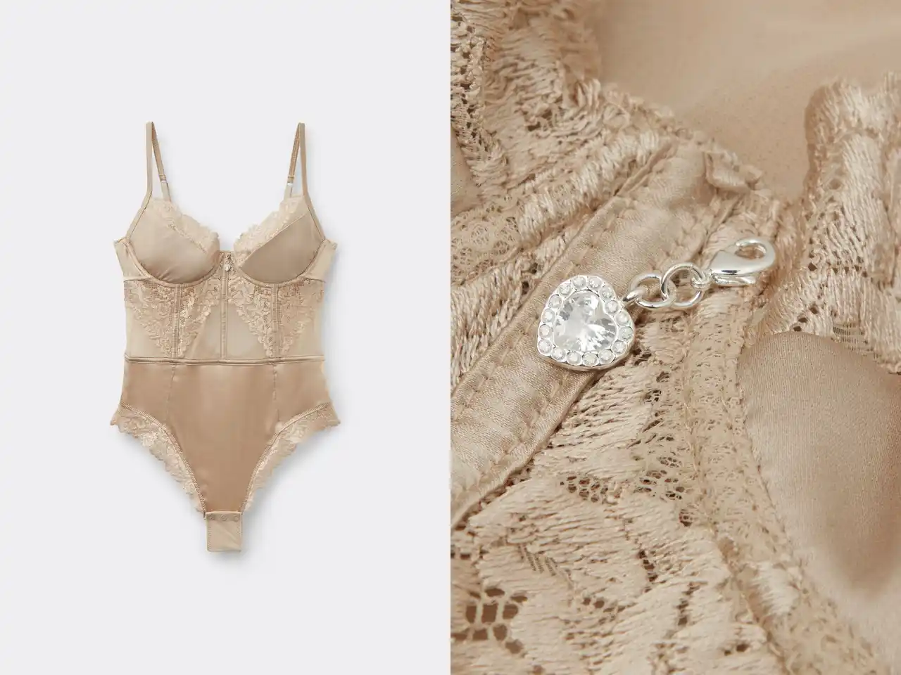 伸縮性のあるシルクサテンに柔らかなチュールを組み合わせたボディスーツ。花の刺繡を施したレースがエレガントでロマンチック。バスト中央には、ラインストーンをあしらったハート型のチャームがきらりと光ります。単品でトップスとしても、ジャケットのインナーとしてもお使いいただけます。 |