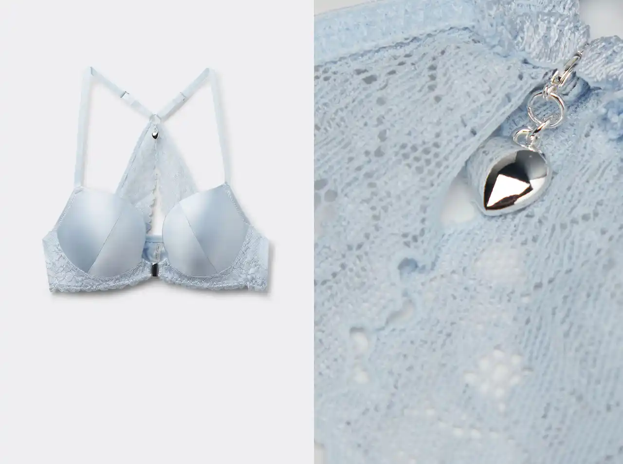 伸縮性のあるシルクサテンのカップに、花の刺繍が美しいストレッチレースを添えたMonica(モニカ)プッシュアップブラ。背中のエレガントなレースと、ラインストーンをあしらったハート型のチャームがポイント。デコルテも背中も美しく見せたい女性にぴったりなモデルです。 |