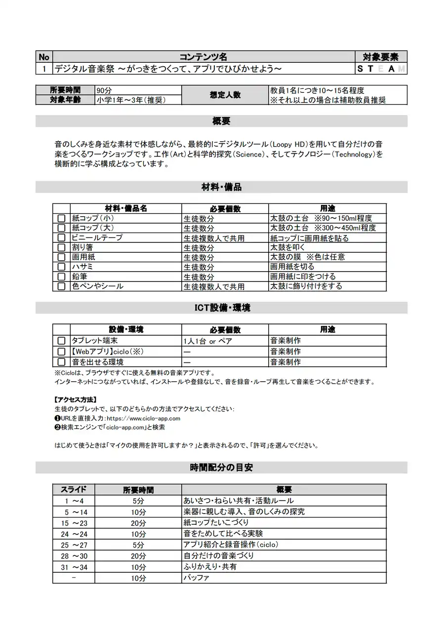 | 「やって終わり」ではなく、参加者の学びと満足度を可視化する「ふりかえりシート」や、主体性・試行錯誤などの「評価観点(簡易ルーブリック)」を標準装備。子どもがどう成長したかを具体的に保護者へ報告できるため、スクールに対する信頼感や満足度の向上、継続率のアップに直結します。 | |||||||||