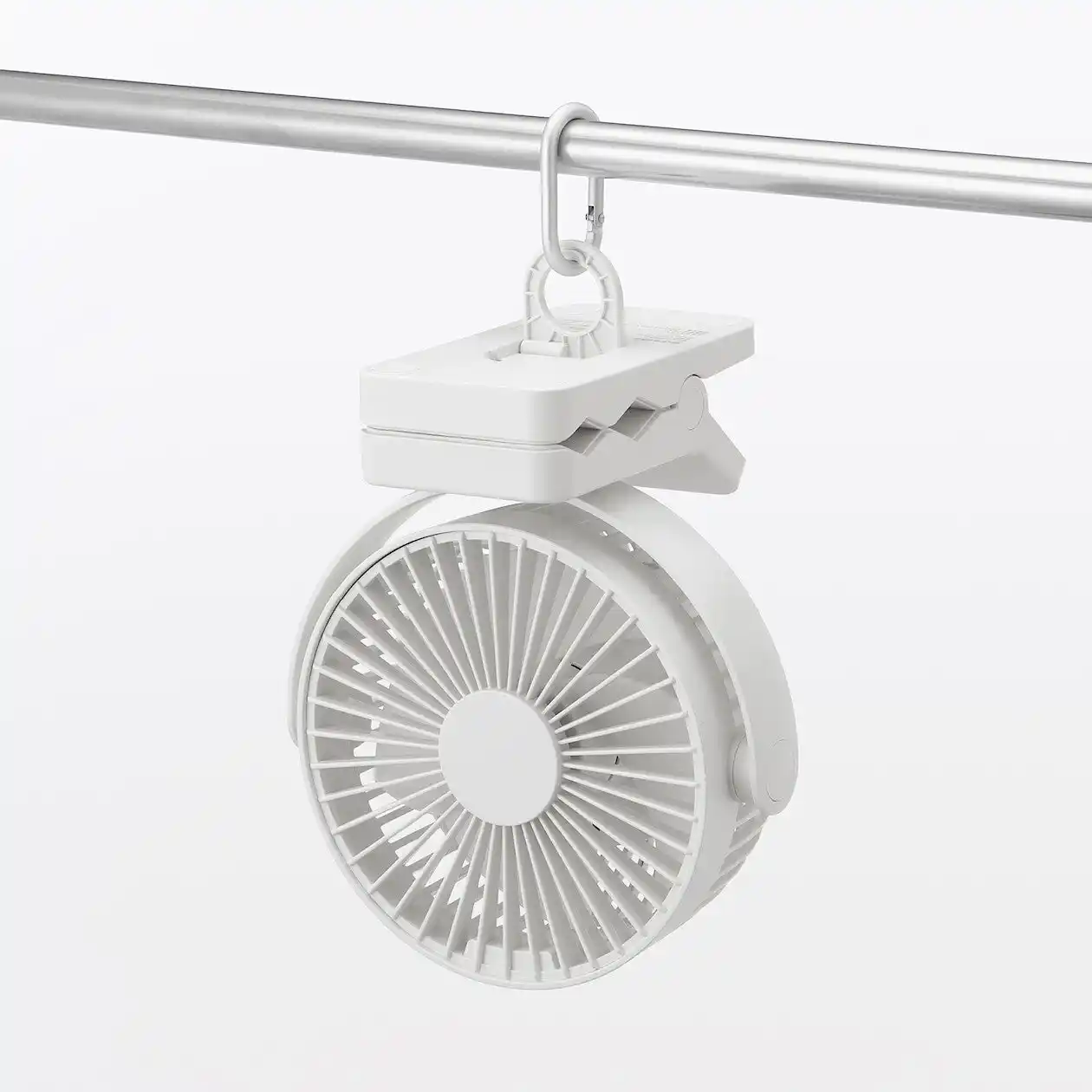 置く・クリップではさむ・カラビナ(フック)で吊るす、の3通りの設置方法で、寝室やキッチンなど室内だけでなく、日傘の柄やベビーカーのハンドル、テントのフックなど外出先でも手軽に使用できます。風量は4段階で切り替え可能で、15分/30分のOFFタイマー付きで、就寝前や短時間使いにも向いています。充電はUSB Type-C充電式を採用しました。 |