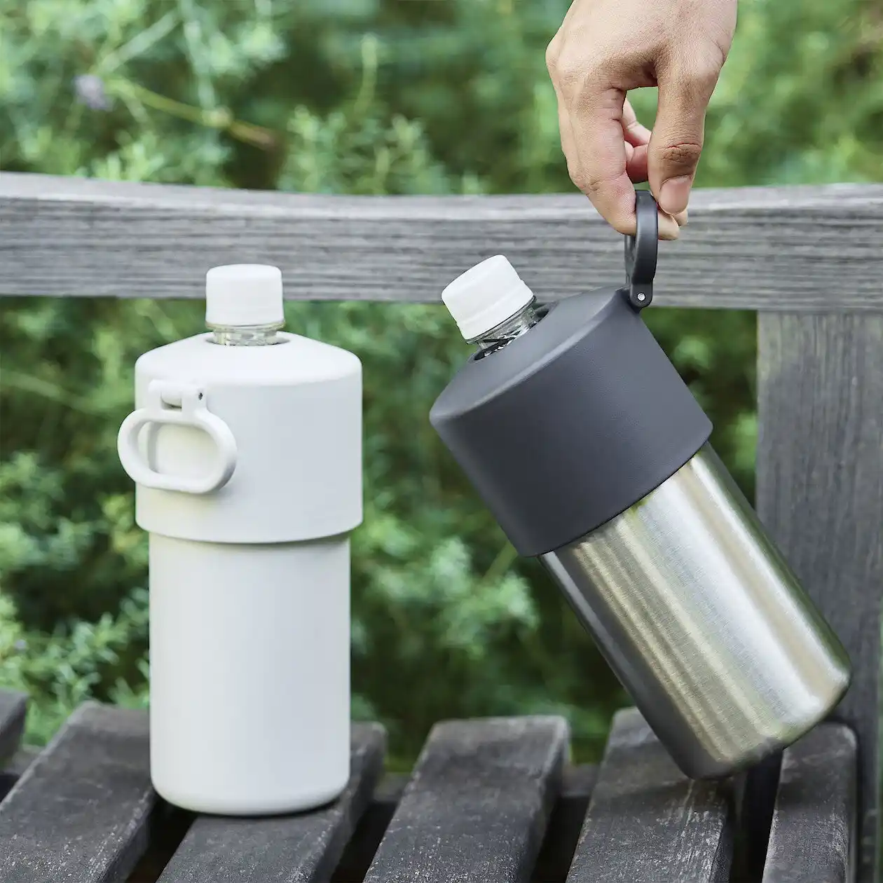 結露が起きにくい真空断熱構造です。カバーを回転させ、ペットボトルにあわせた高さに調整できます。ハンドル部の形状を改良し、可動できる仕様にすることでハンドルがかさばらず、コンパクトに収納できます。また、容量600mlの角型形状ペットボトルも対応できるようになりました。 |