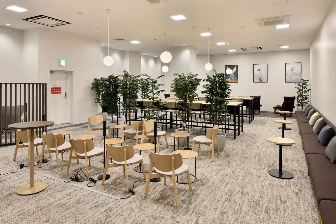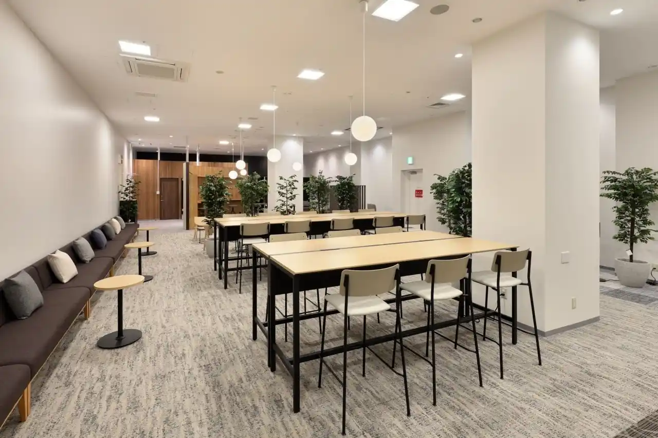 円形ブースを中心に、対話と個人の集中の双方に対応。周囲の家具はレイアウト変更が可能で、日常利用からイベント・ワークショップまで柔軟に活用できます。 |