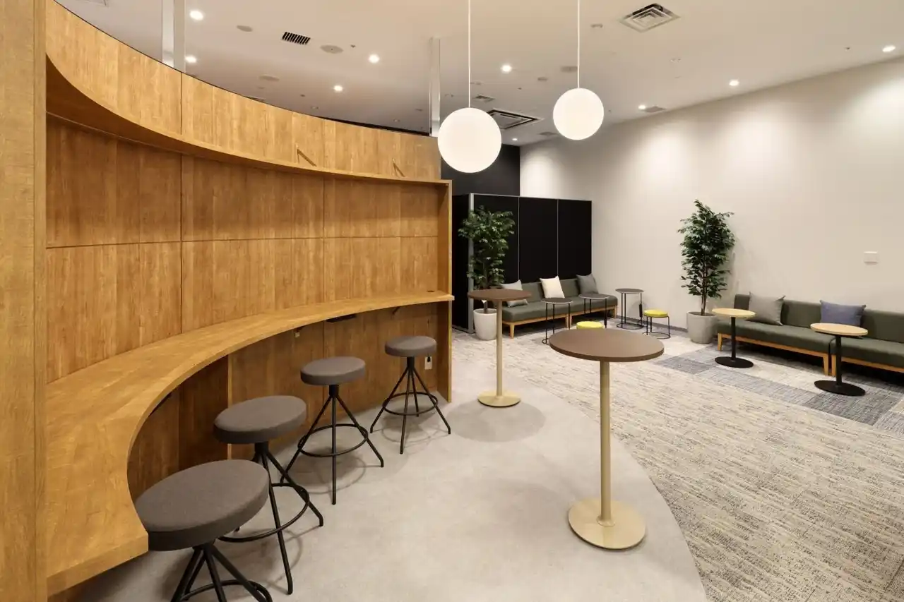 柔らかな曲線を描くラウンドウォールが、業務エリアとの心理的な切り替えを促進。木目やタイルの質感と落ち着いた照明により、ワーカーを穏やかに迎え入れ、休息へと導きます。 |