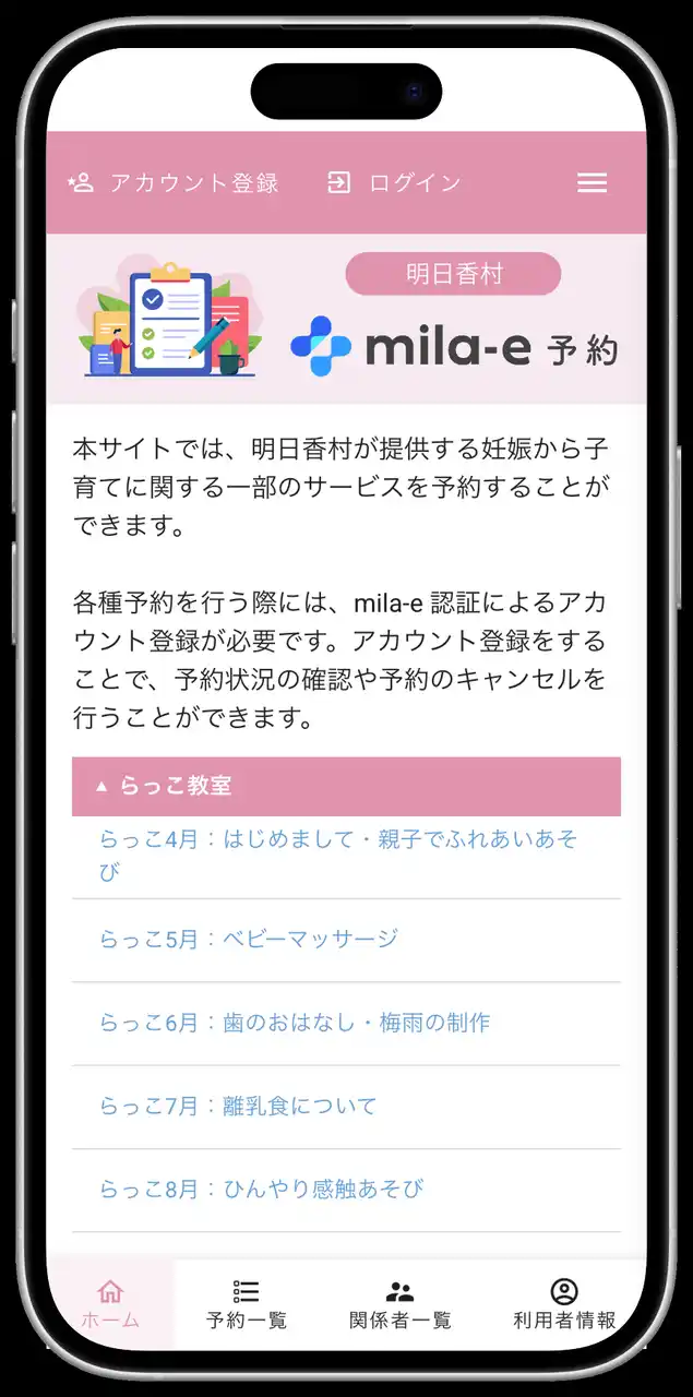 mila-e おやこ手帳 TOP画面の「各種予約」からアクセス後、お持ちのmila-e 認証アカウントにてログイン、利用者情報を入力し予約を行ってください。 |