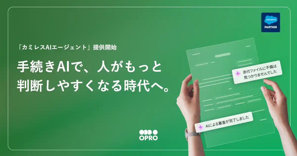 株式会社オプロ(本社:東京都中央区、代表取締役社長:里見 一典、以下「オプロ」)は本日、あらゆる申請や承認プロセスを効率化するAIエージェント「カミレスAIエージェント」をSalesforceのAgentExchange(パートナー、開発者、およびAgentblazerコミュニティが、企業がAIエージェントを迅速に作成・展開するためのソリューションを見つけ、試用し、購入することができる信頼できるマーケットプレイスおよびコミュニティ)にリリースしたことを発表しました。 |