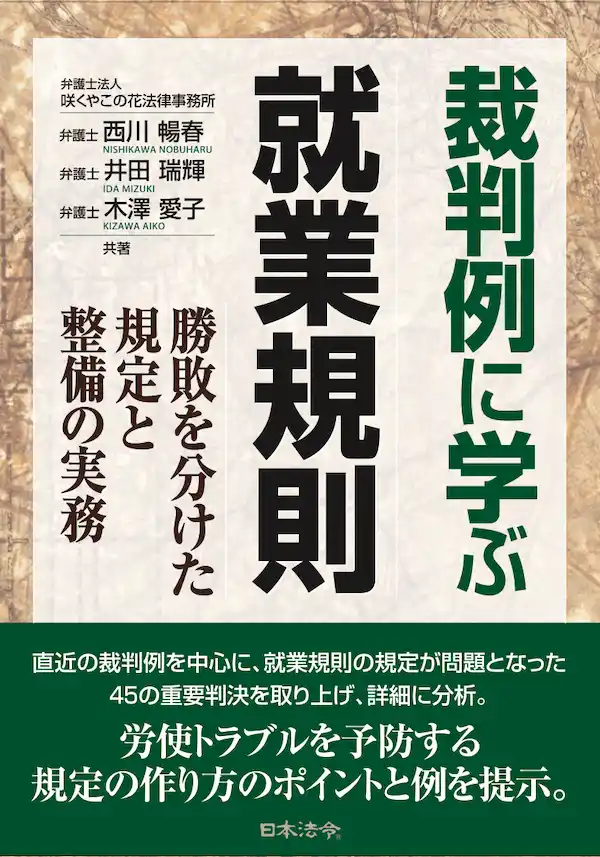 | 全国約650社の顧問先(2026年3月現在)の実績があり、労働問題や人事労務を中心とした企業法務に特化した法律事務所として「企業法務の法律相談サービス」や、お役立ち情報Webメディア「咲くや企業法務.NET」、チャンネル登録数2.9万人の「公式YouTubeチャンネル」などを運営する、弁護士法人 咲くやこの花法律事務所(所在地:大阪市西区)の代表弁護士 西川暢春/弁護士 井田 瑞輝/弁護士 木澤 愛子が、新刊書籍『裁判例に学ぶ就業規則ー勝敗を分けた規定と整備の実務』(出版社:株式会社日本法令)を2026年3月25日に発売しました。 | |||||||||||||||