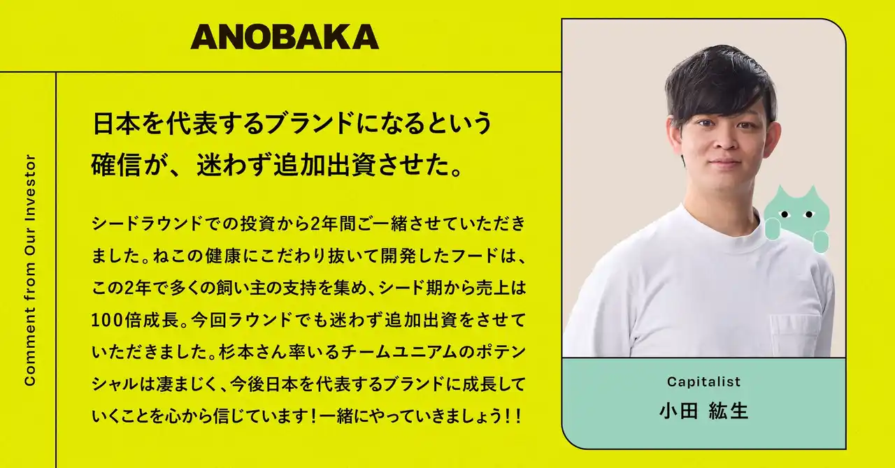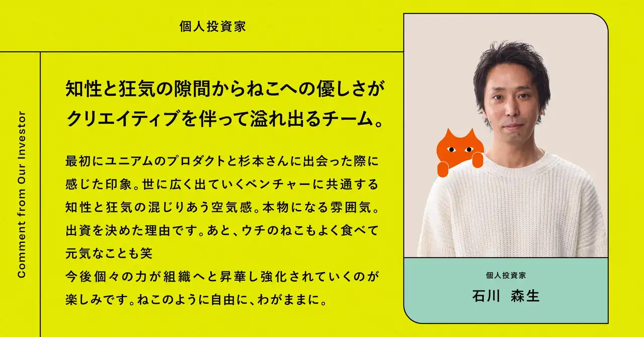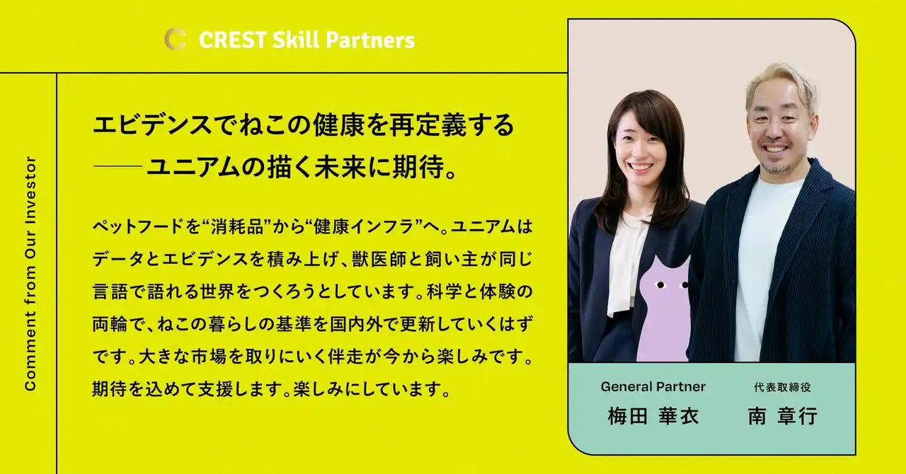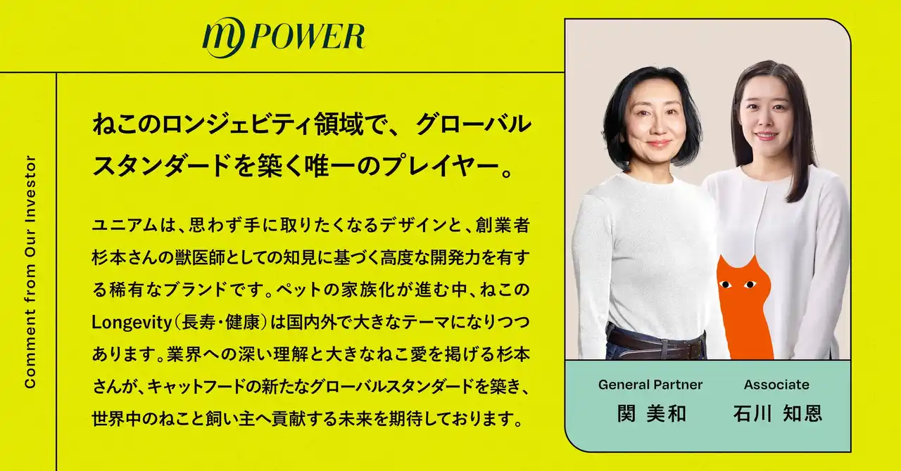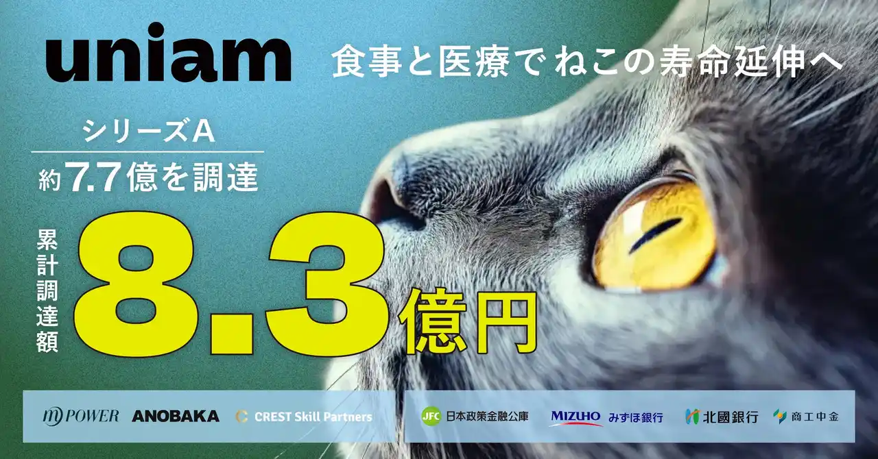 | 「ねこの一生に、愛と医学を。」をミッションに掲げ、ねこ特化型ヘルスケアブランドを展開する株式会社uniam(本社:東京都渋谷区、代表取締役:杉本 亜衣、以下 当社)は、WPower Fundをリード投資家とし、株式会社ANOBAKA、株式会社クレストスキルパートナーズ、および個人投資家を引受先とした第三者割当増資に加え、日本政策金融公庫、みずほ銀行、北國銀行、商工中金などの金融機関からの融資を合わせ、総額約7.7億円の資金調達を実施したことをお知らせいたします。 | |||||||||||||||||||||