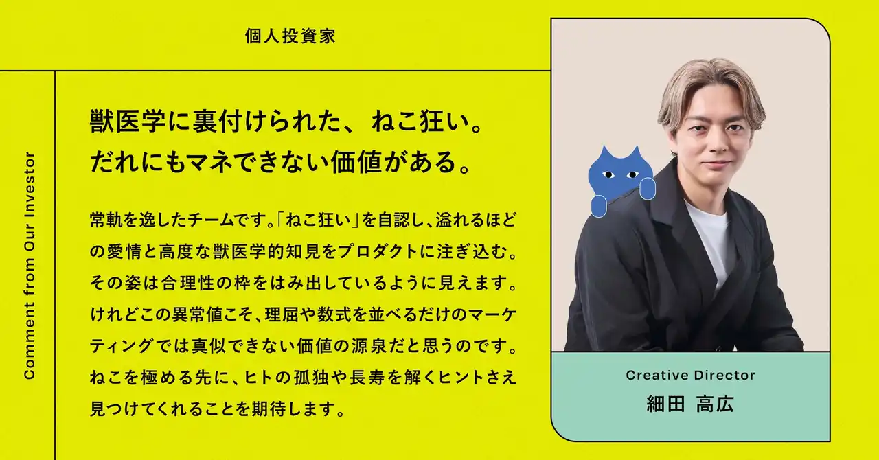 当社は、「ねこの一生に、愛と医学を。」をミッションに、ねこの健康寿命延伸に挑んでいます。 今回の資金調達は、単に事業を拡大するためのものではなく、ねこの健康と寿命の常識を書き換えるための大きな一歩だと考えています。 |