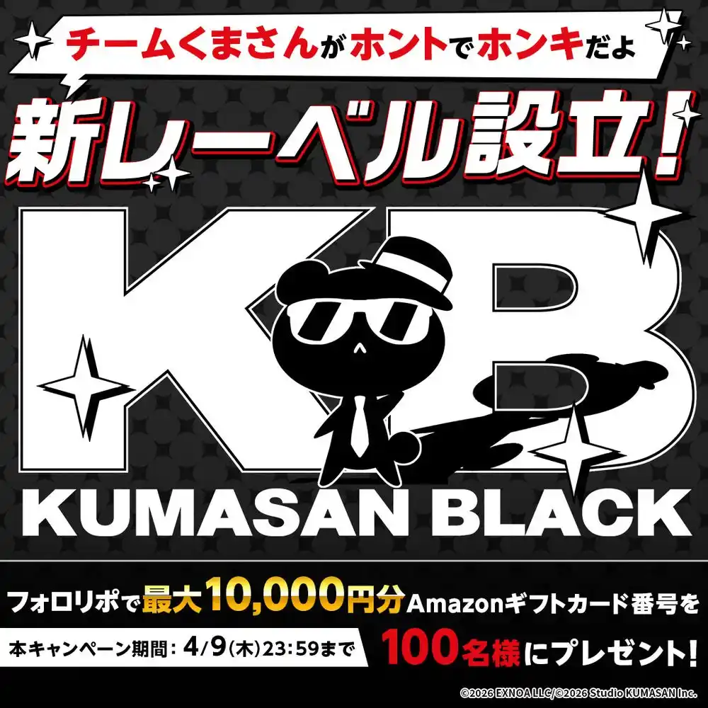 新レーベル「くまさんブラック」の設立決定を記念し、Amazonギフトカード番号が100名様に当たるフォロー&リポストキャンペーンをXにて開催します。 |