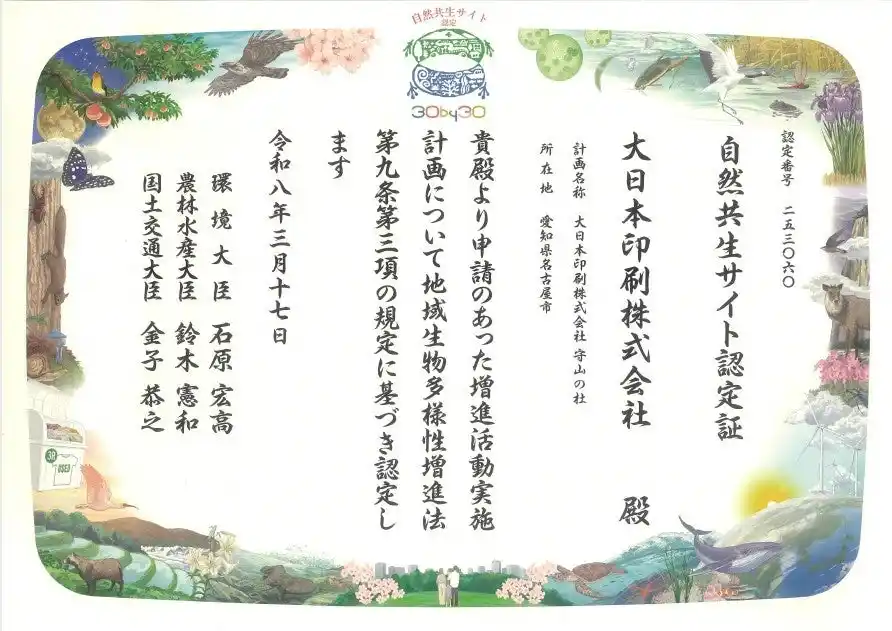 大日本印刷株式会社(DNP)は、名古屋事業所(愛知県名古屋市守山区)の敷地内に創出した緑地「守山の杜」で、地域在来の植生の維持・再生に向けた取り組みを2012年から進めています。このたび同緑地が、環境省などが認定する「自然共生サイト」の「創出タイプ」に認定されました。 |