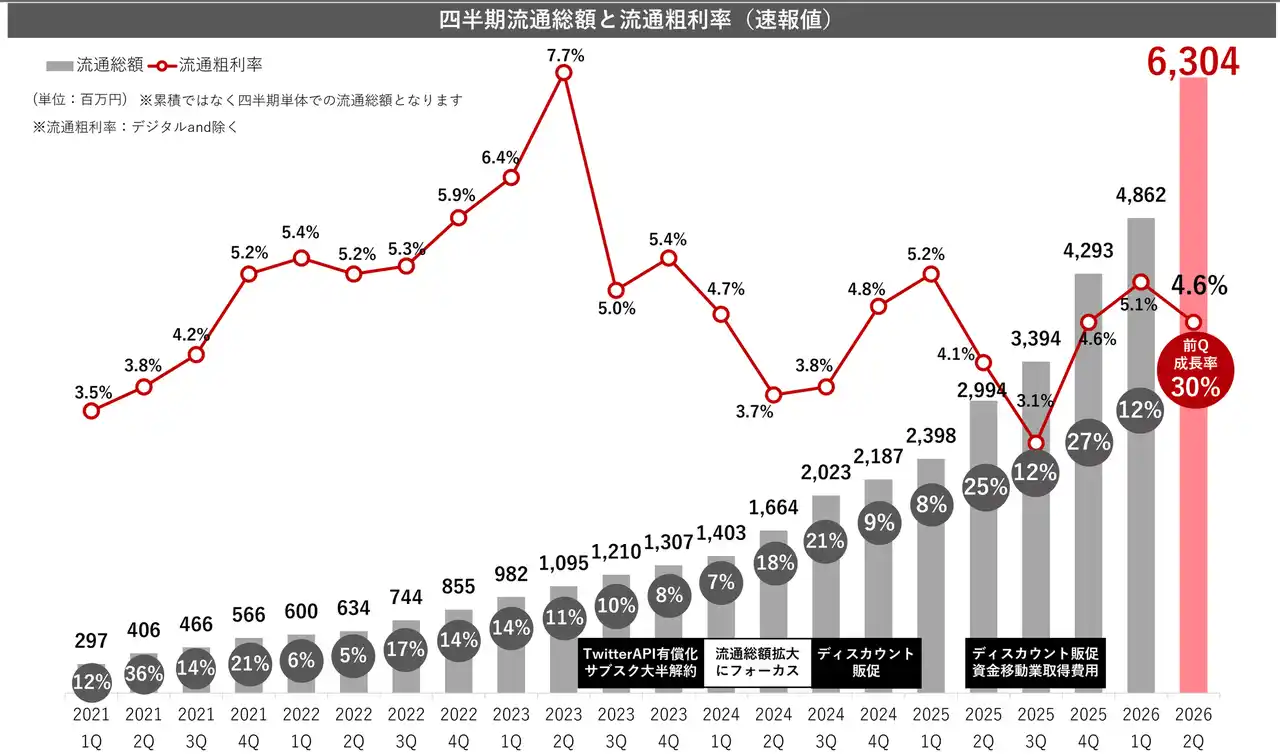 その結果、当第2四半期においては、大口案件の獲得および既存取引の拡大により流通総額が大きく伸長し、24四半期連続成長を実現いたしました。特に、新規案件の獲得が進んだことにより、流通の積み上がりに寄与しております。 |