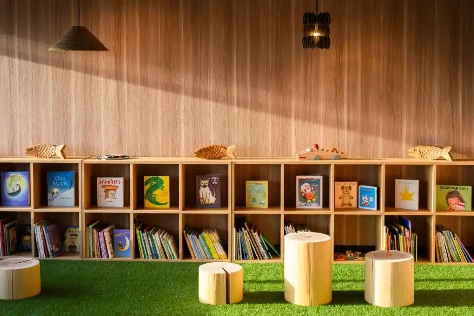 ラウンジ中央には、空間の象徴として、長年大切に使われてきた古道具のテーブルを配置しました。また、ホテルスタッフが選書した橿原・飛鳥エリアの歴史や文化に関する書籍を集めた本棚も設け、滞在中のひとときが自然と地域への関心につながる仕掛けを施しています。 さらに、ラウンジ奥にはファミリーでお過ごしいただけるキッズスペースを設けました。小上がりの一角には人工芝と丸太を配置し、小さなお子さまが安全に遊べる環境を整備。 もう一方には子ども用の学童机と椅子を設け、読書や静かな時間を過ごせる空間としています。祖父母世代が語り、親世代がくつろぎ、子ども世代が遊び・学ぶ、三世代が同じ空間で自然に時間を共有できる、温かみのある場所です。 営業時間 15:00~19:30/21:00~23:00 |